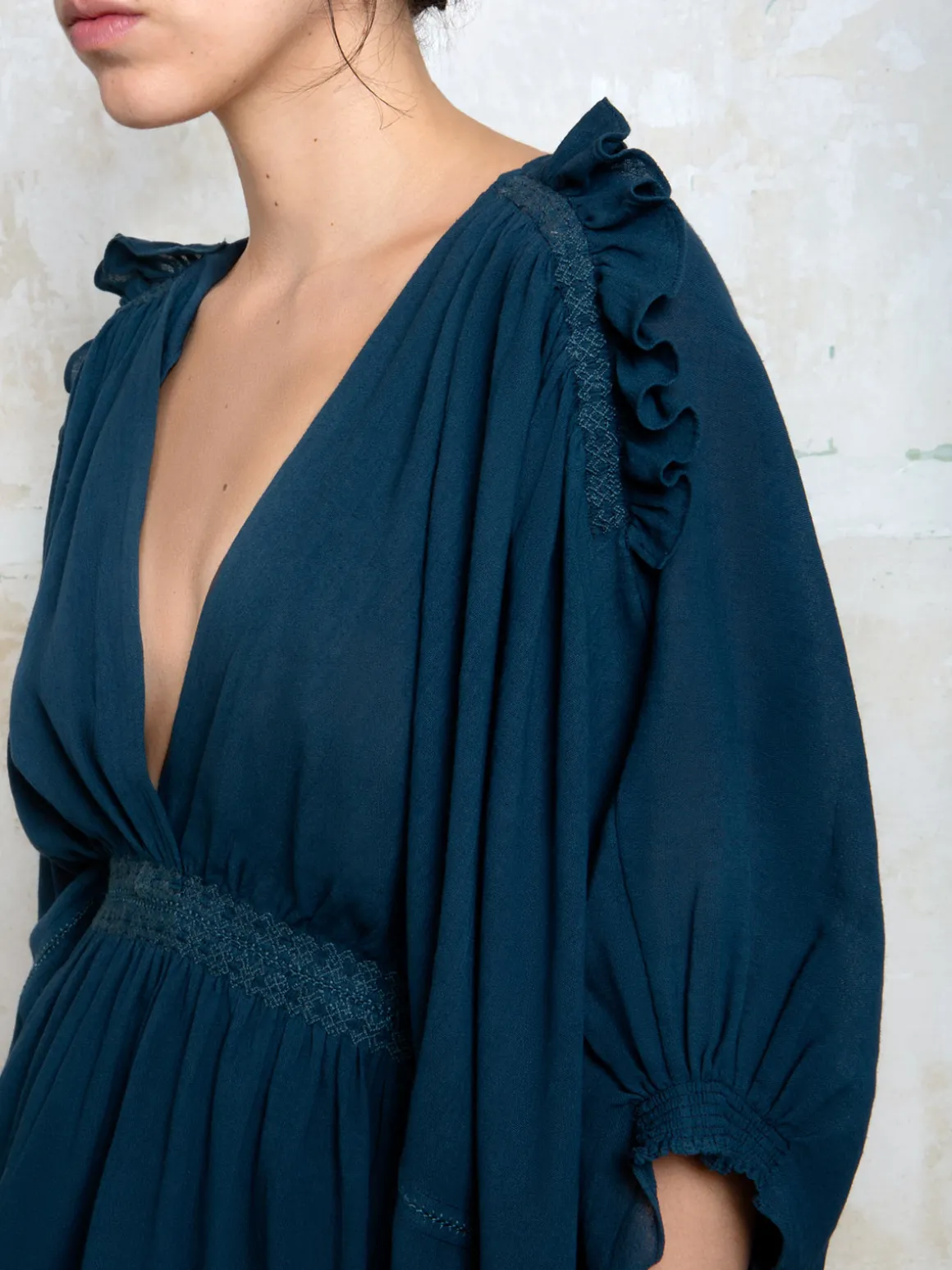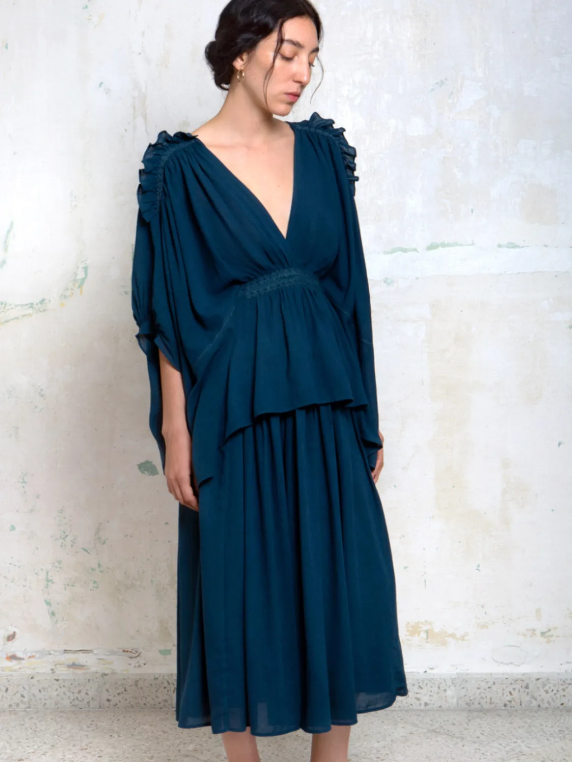 Our Collectiva Concepcion Alberta Top in Indigo features a gathered waist, 3/4 length sleeves, a V-neckline, and a kaftan-inspired silhouette. The intricate gathering and embroidered detail is specific to the Chenalhó community in Chiapas. Handcrafted by artisans in Mexico.