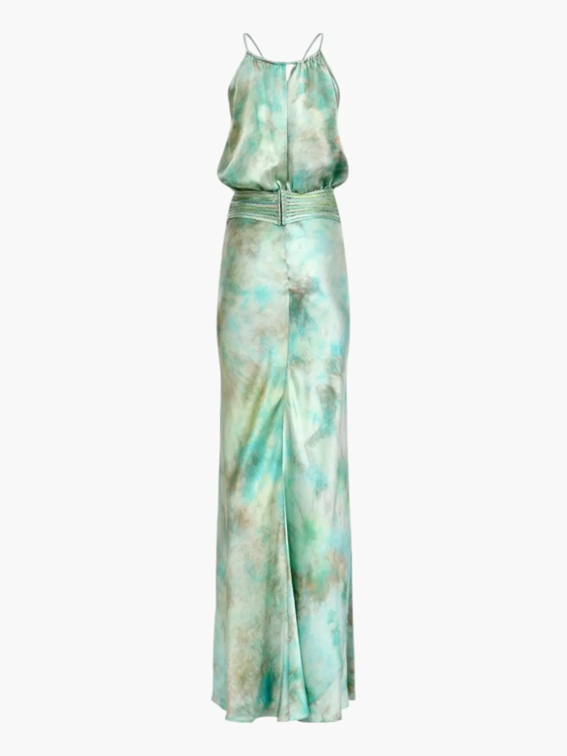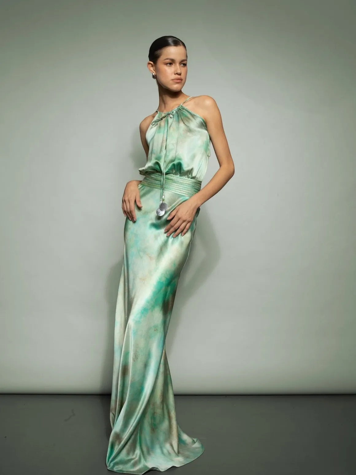 Our Francesca Miranda Billie Hand-Dyed Silk Dress is maxi length featuring a handcrafted belt around the waist that cinches in. The top is a halter style with strings attached that hang in the front. Handcrafted by female heads of households in Colombia.