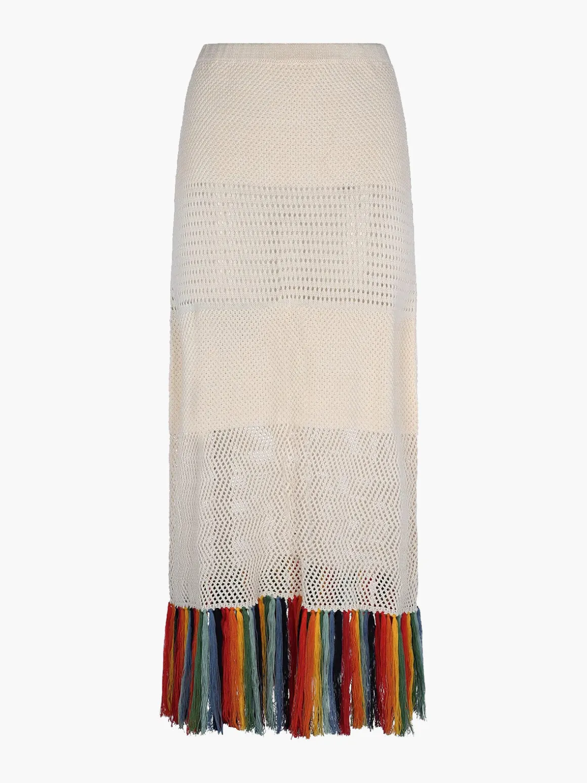 Our ESCVDO Carisa Skirt in Multi features a pull-on midi silhouette finished with fringes at the hem. Crafted by Vilma Bautista in her workshop in Lima, Peru.