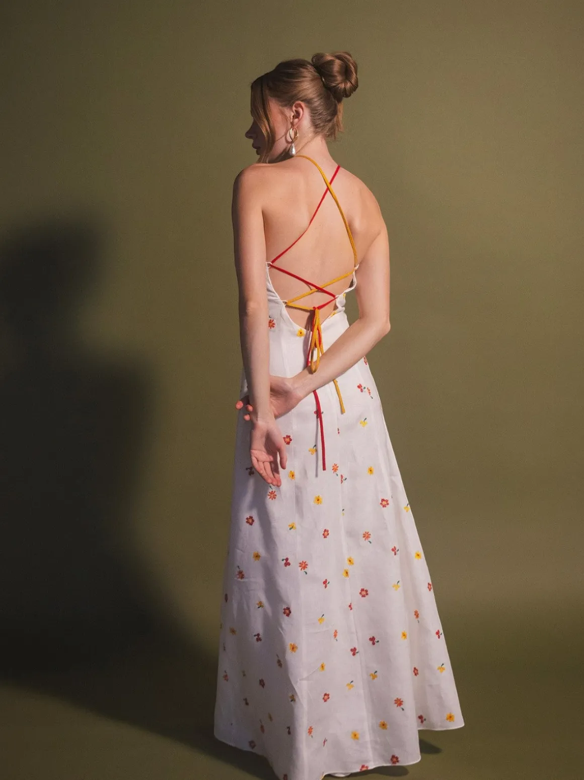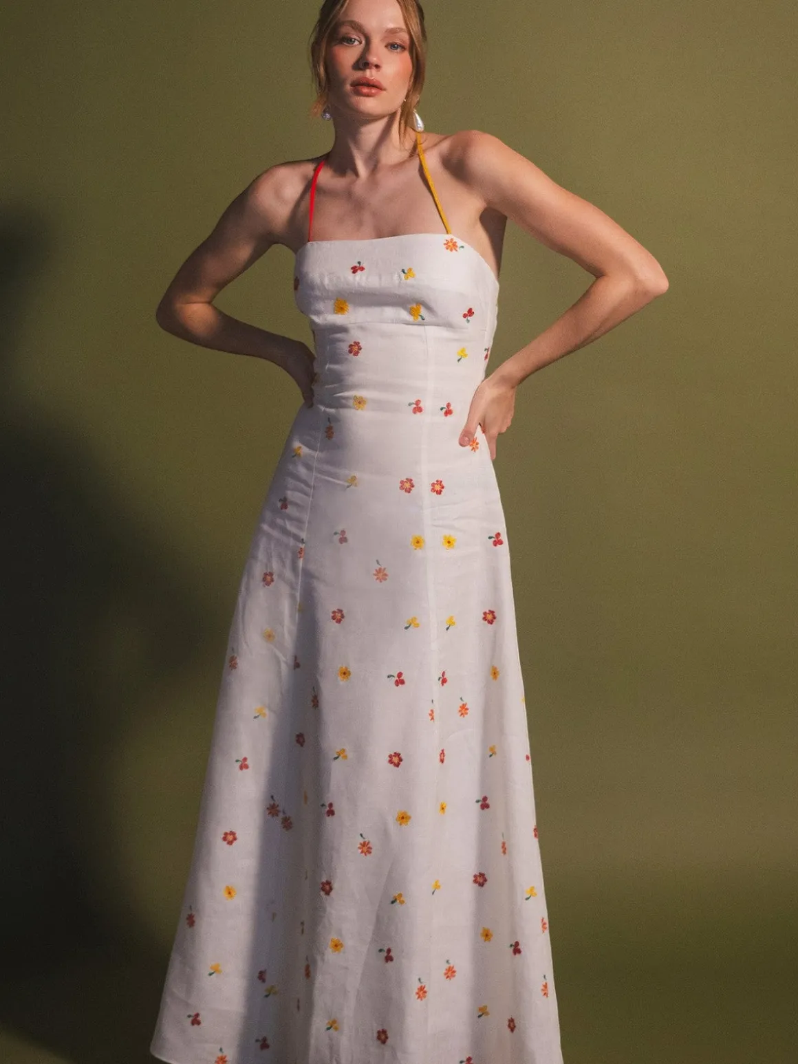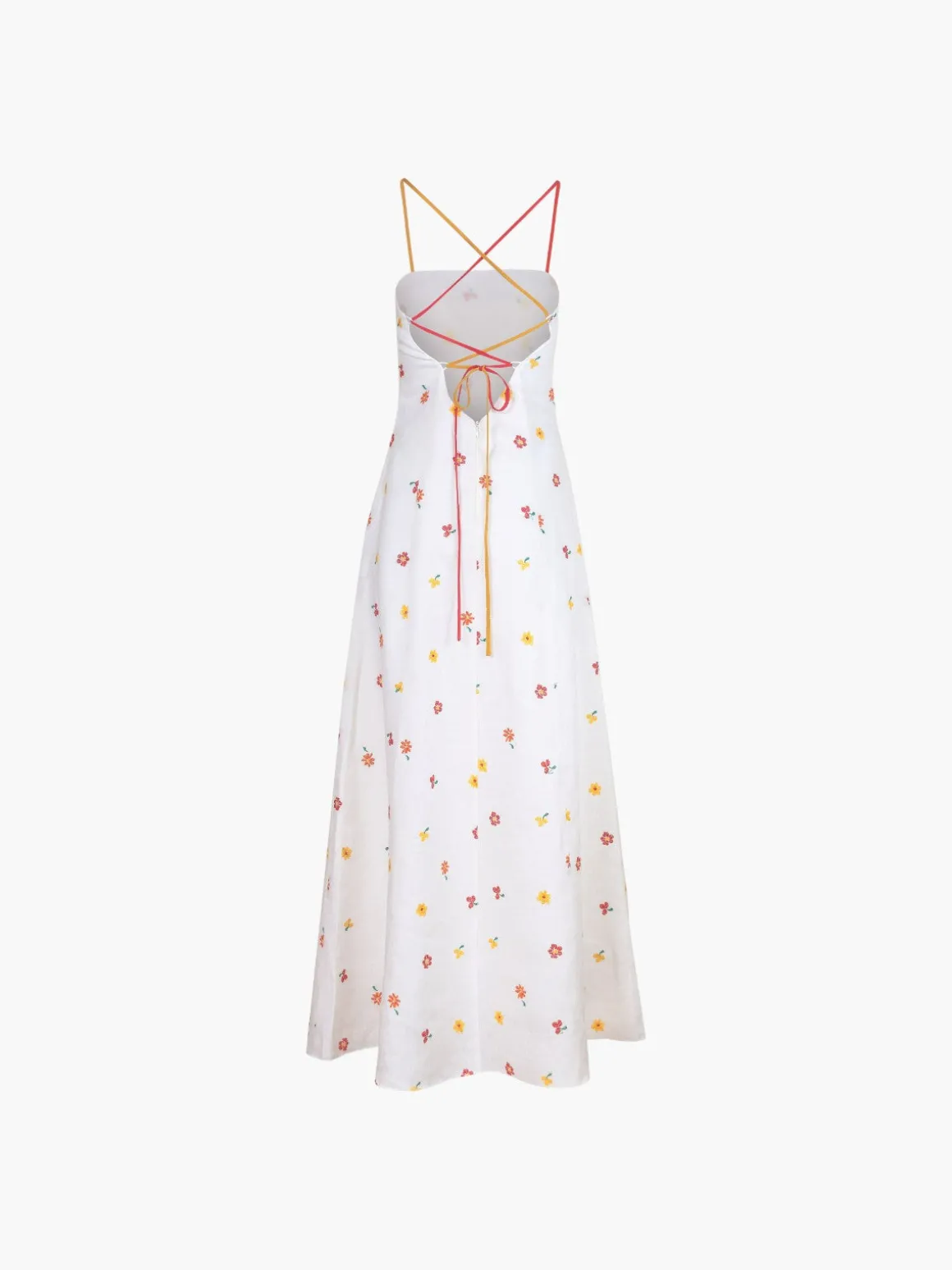 Our Estefania Cherry Tomato Rainbow Dress is a maxi length with a flowing skirt. The dress features thin red straps that tie in the back. Handcrafted in Colombia by female heads of households.