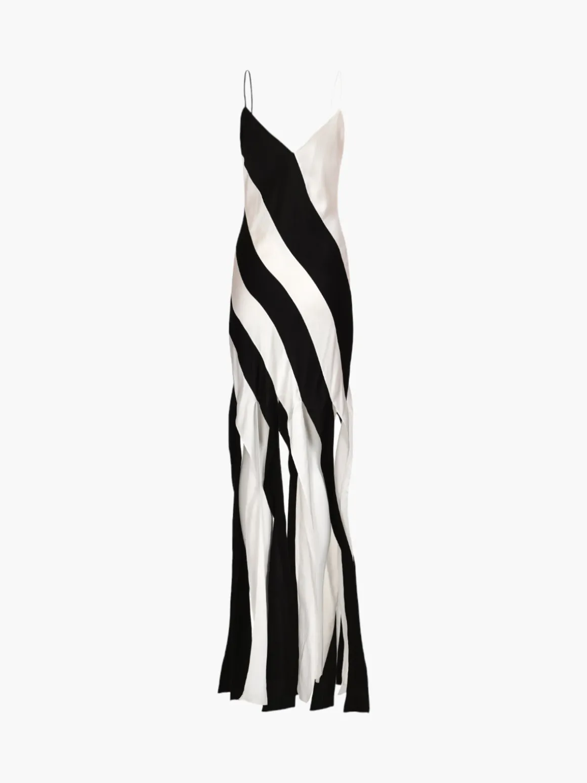 Our Francesca Miranda Claire Silk Dress is a maxi length dress with a slit on the side. This dress features a black and white stripe design with spaghetti straps. Handcrafted by female heads of households in Colombia.