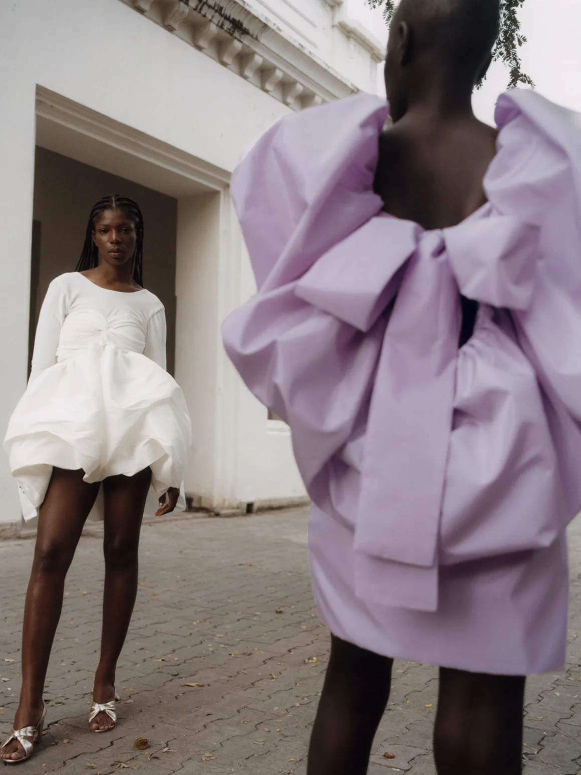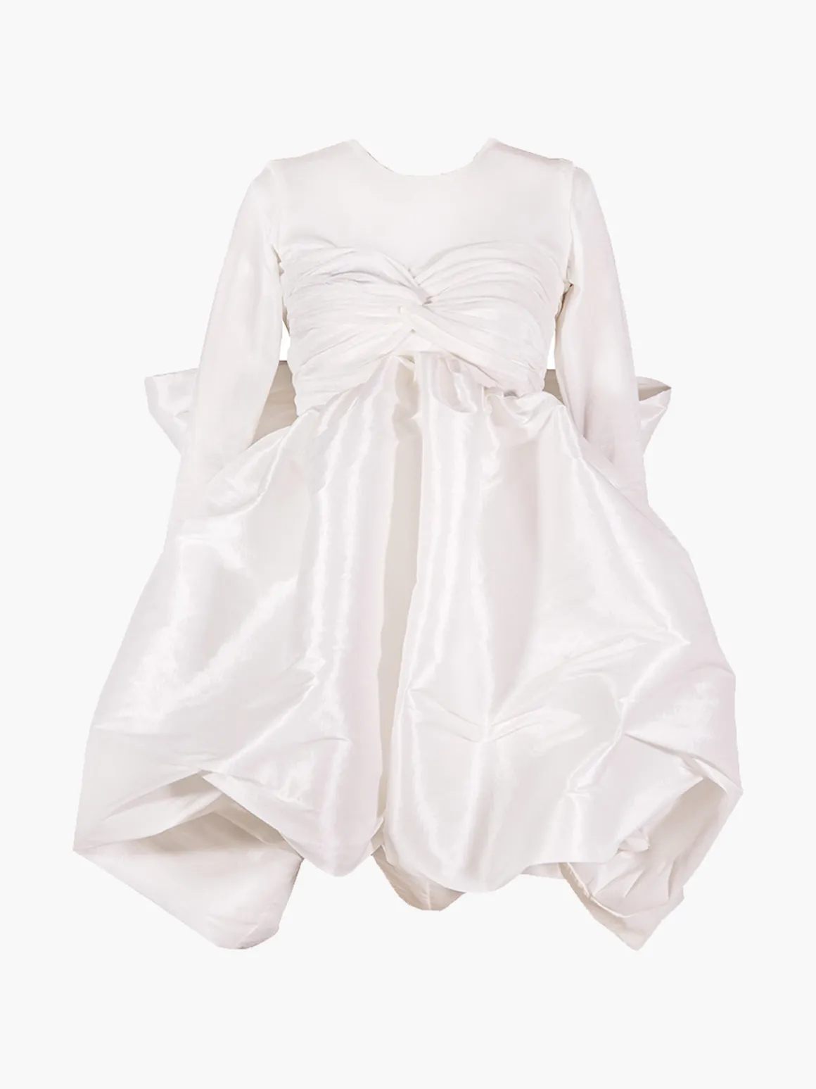 Our By Efrain Mogollon Costa Dress boasts a voluminous mini silhouette with long sleeves, a twist knot detail across the chest, a balloon hem, and a low back with an oversized bow. Handcrafted by artisans in Venezuela.