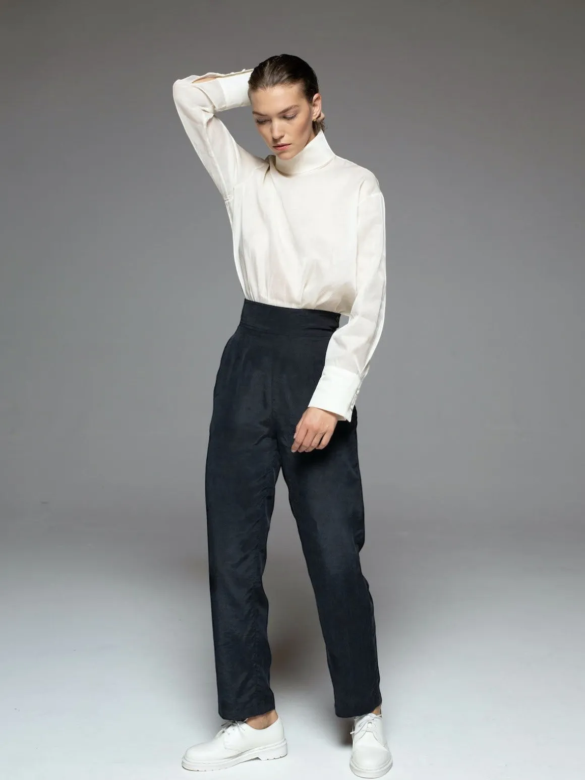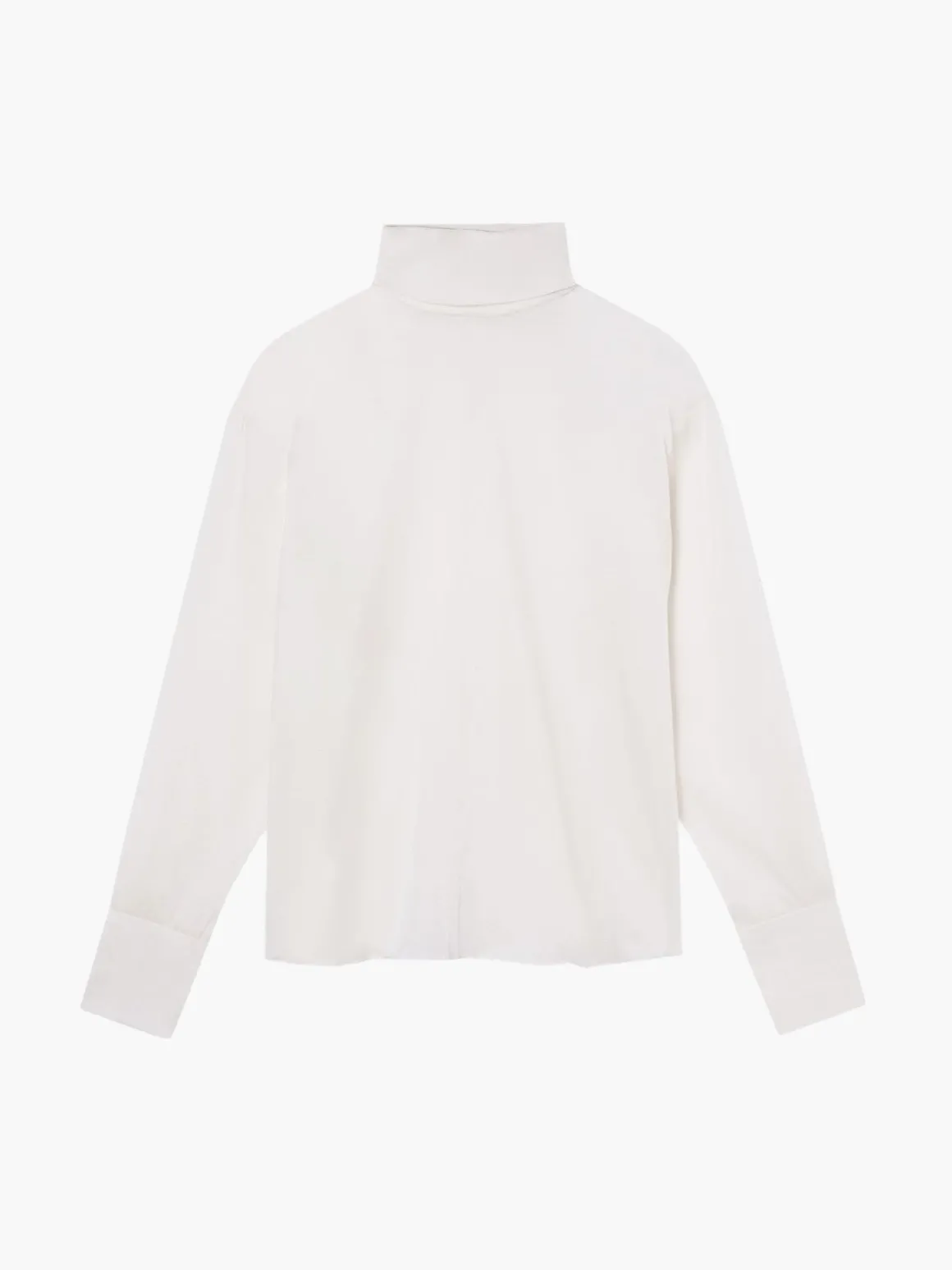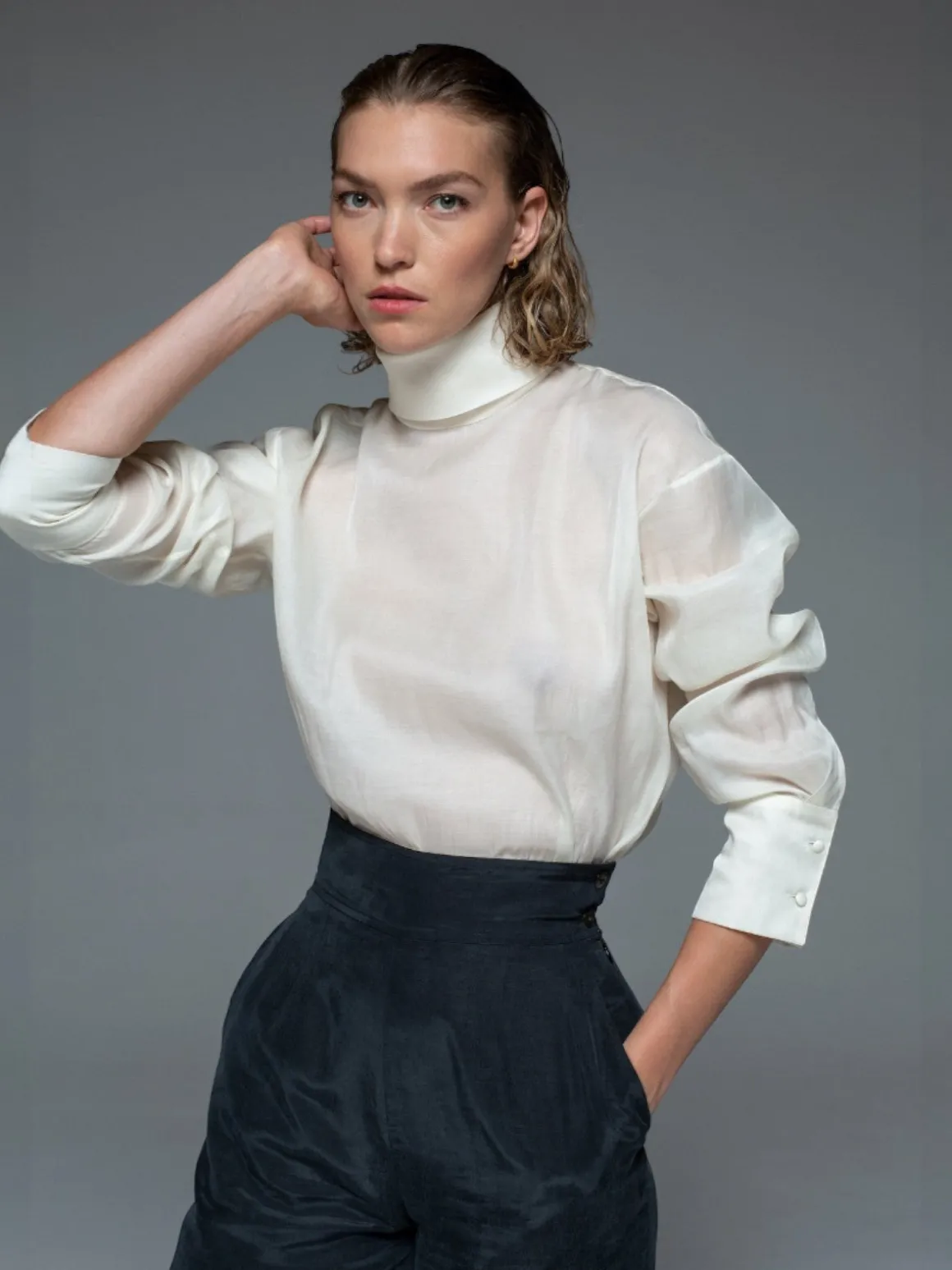 Our Olistic Cygnus Shirt is a long-sleeved shirt, crafted from peace silk and cotton, is a quintessential element of a sustainable feminine wardrobe. Light and translucent, it drapes like a second skin, gracefully revealing the contours of the silhouette. The oversized cut and dropped sleeves underscore the modernity of this chic, contemporary piece. Its luxurious collar, adorned with covered buttons, elevates the neckline. Handcrafted by artisans in Portugal.