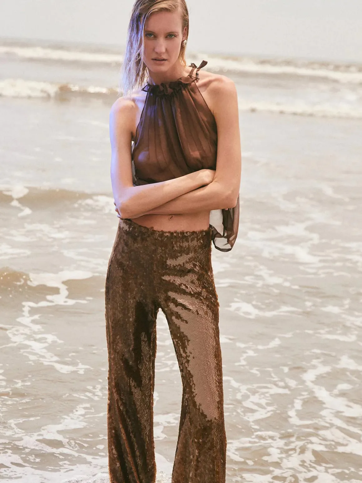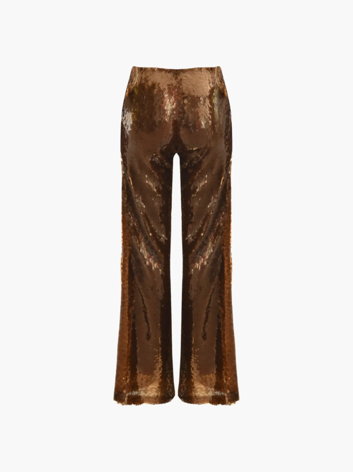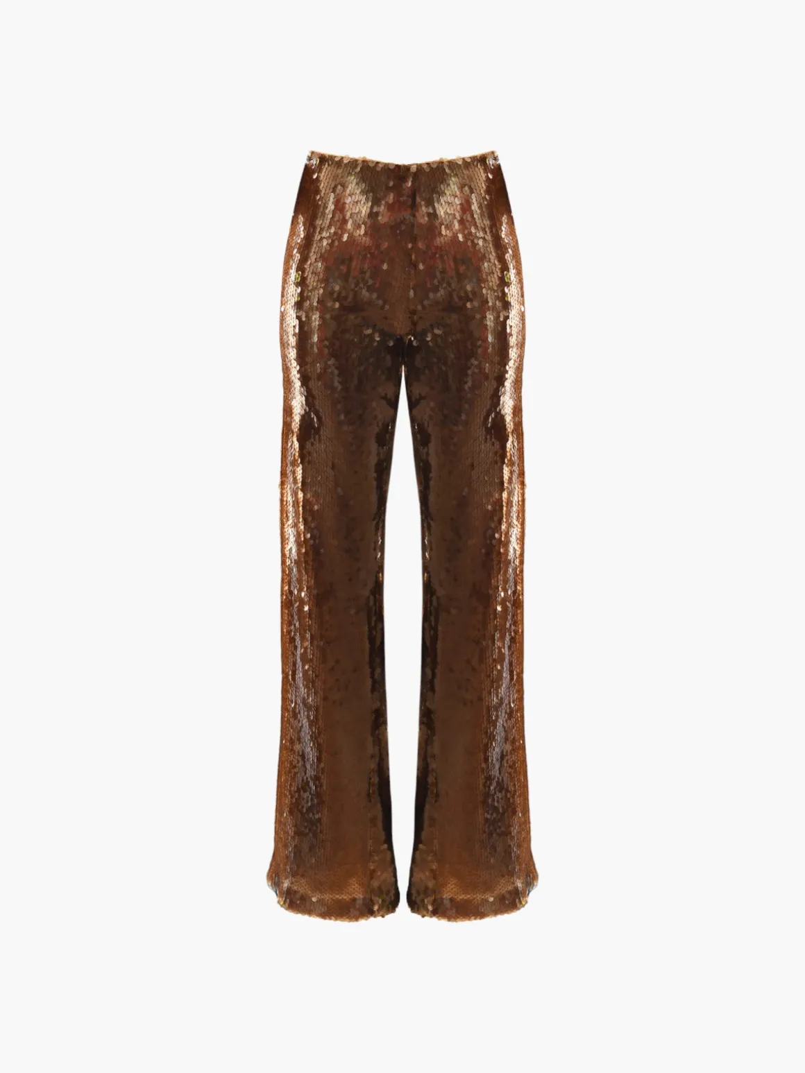 Our Francesca Miranda Elena Sequin Pants in Coffee has a natural waistline with wide legs. These pants feature a beautiful sequin detailing. Handcrafted by female heads of households in Colombia.