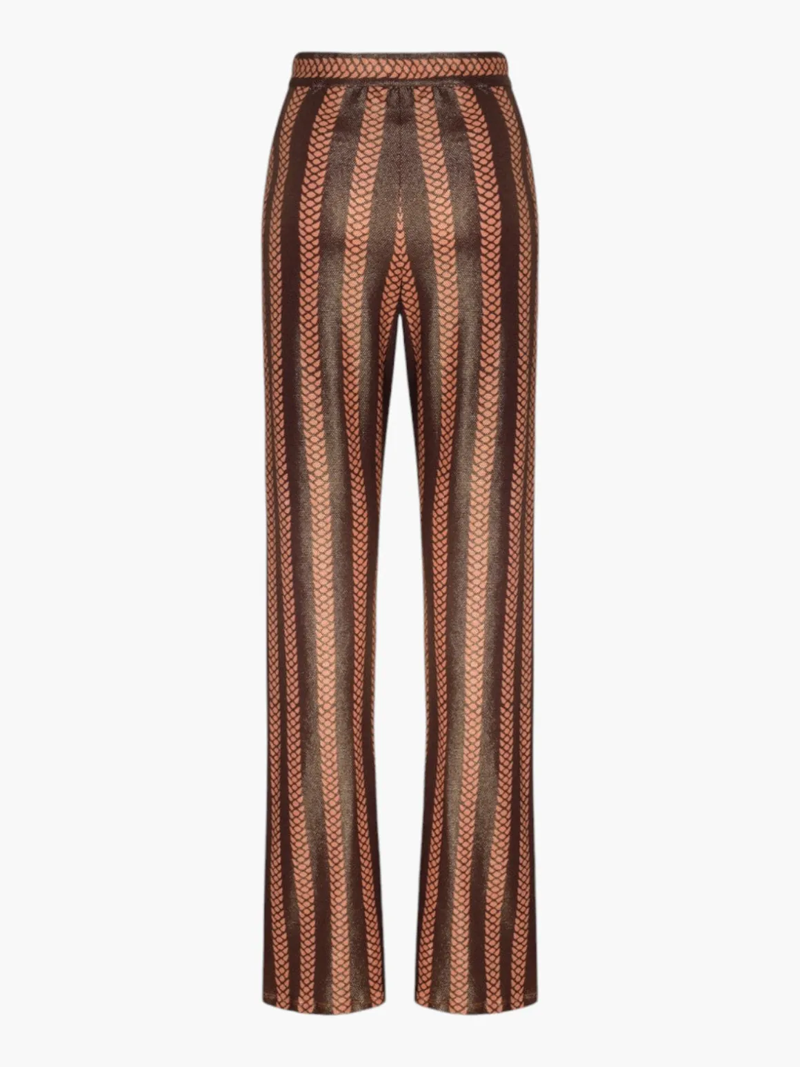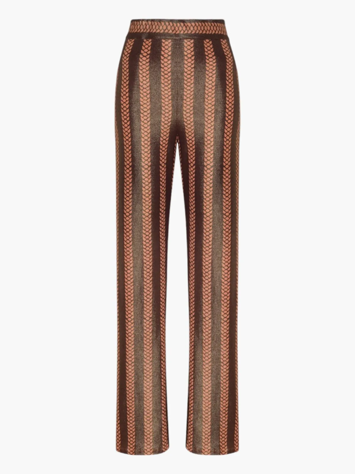 Our Juan de Dios Fado Pants in Gold are a high rise straight leg pant made in a metallic serpent print. Handcrafted in Colombia by female heads of households.