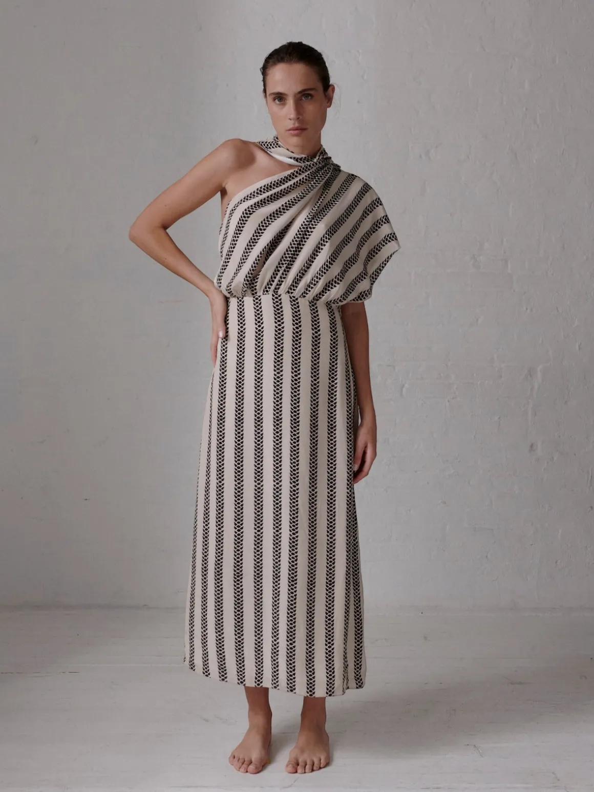 Midi Skirtu0026quot;}”>Our Juan de Dios Gioconda Crepe Viscose Midi Dress in Beige Black Snake is a feminine one-shoulder, draped silhouette with a waist flattering skirt. Handcrafted in Colombia by female heads of households.