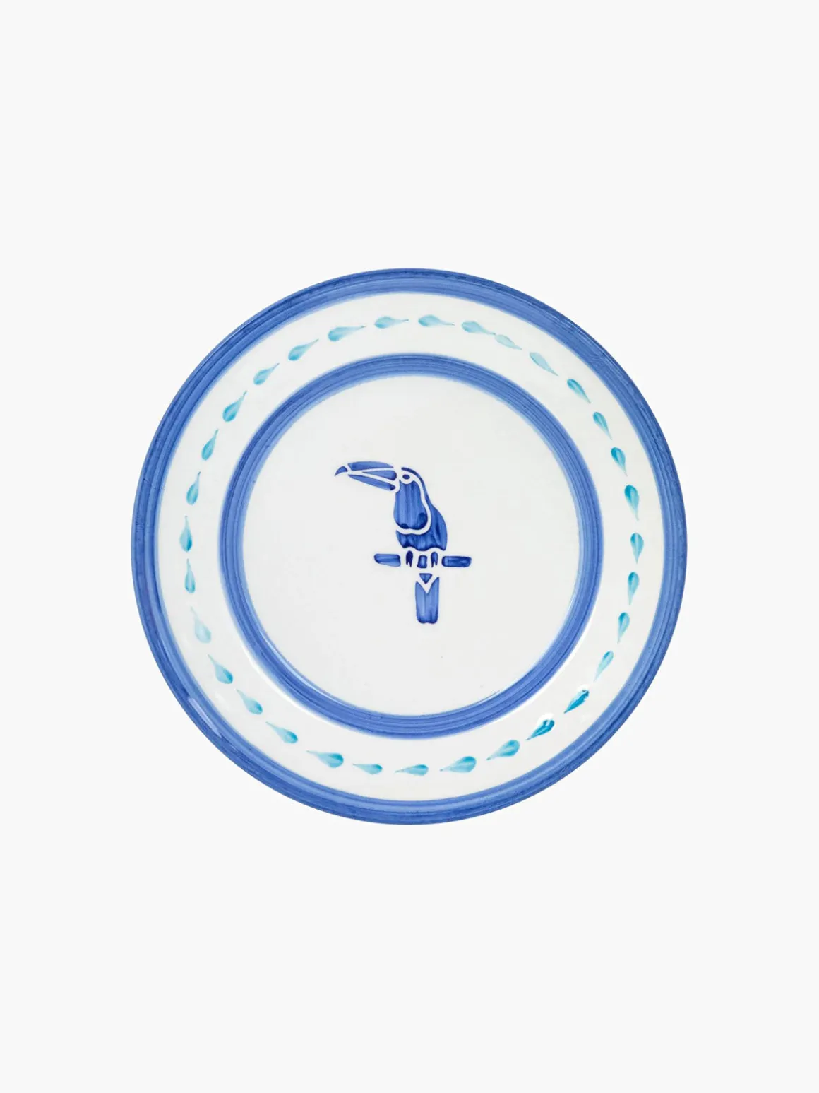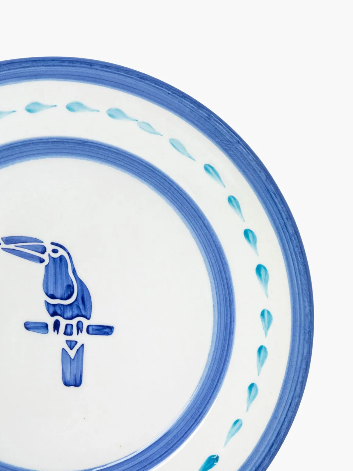 Our Juan De Dios Hand Painted Dinner Plate in Blue Tucan is inspired by a childhood memory of a favorite bird. Featuring a striking Tucan pattern against a white ceramic finish adds a graceful pop of color to your table. Mix u0026amp; Match with the collection of vibrant ceramic plates for your own unique table setting. Handcrafted and painted by female heads of households in Colombia. Dishwasher and microwave safe.
