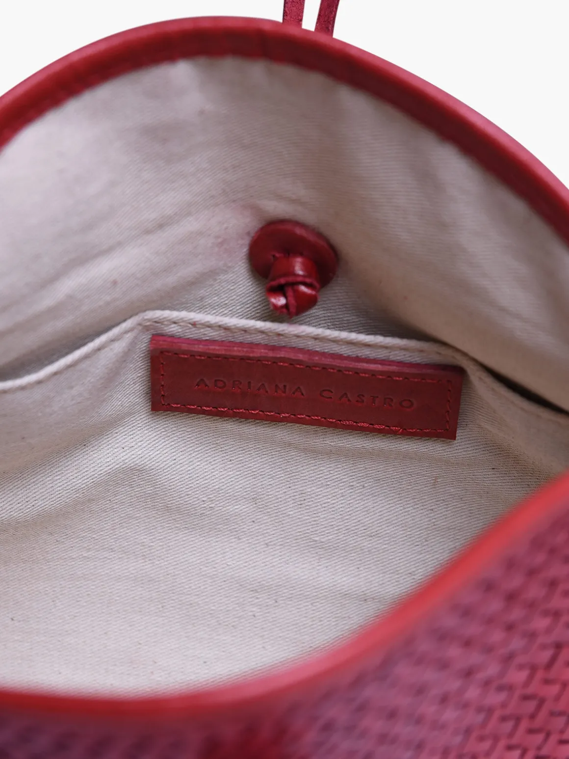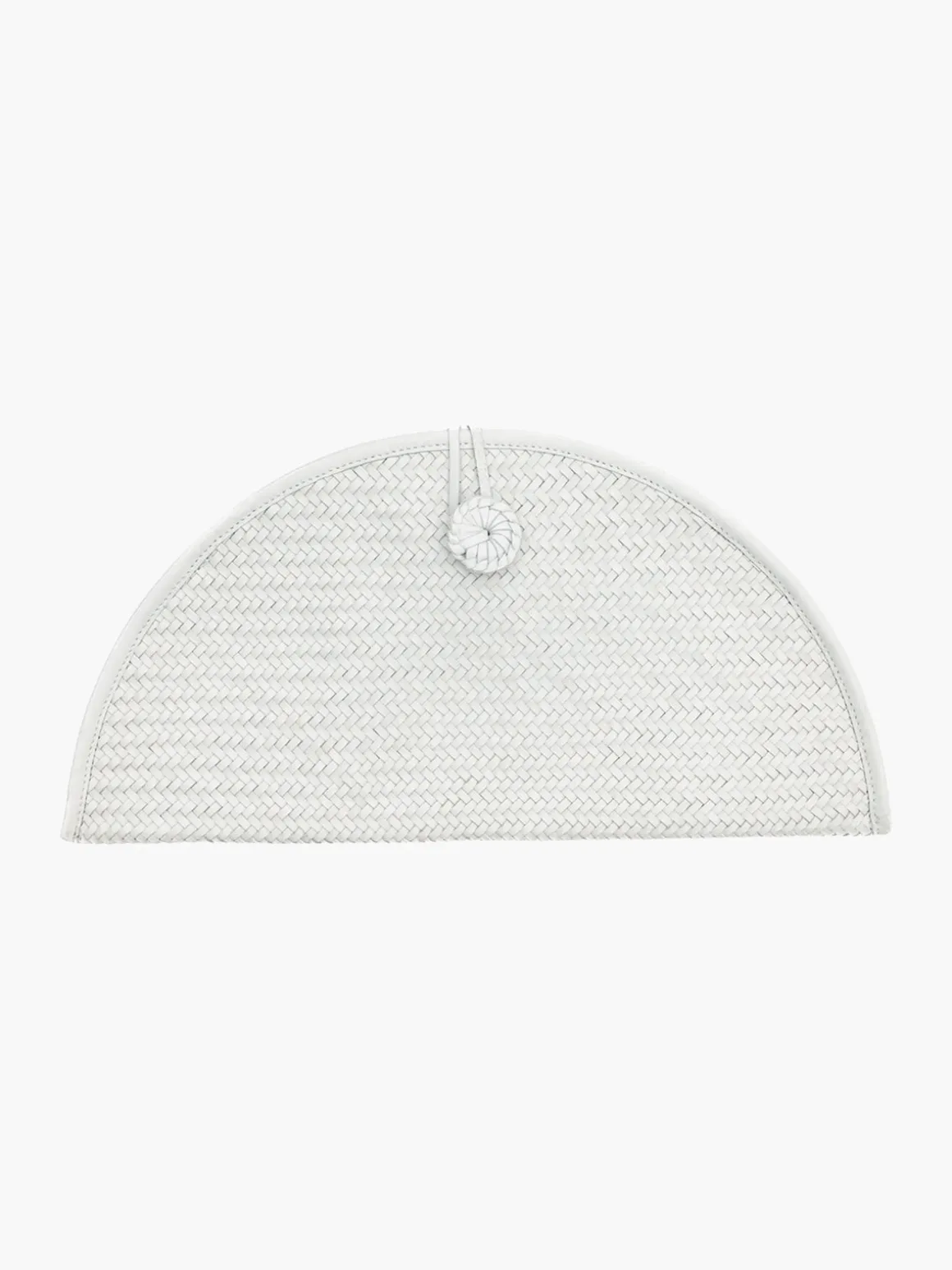 Our Adriana Castro La Barca Handbag in White features a structured half-moon silhouette with a curved top and a straight bottom. This clutch bag is detailed with a canvas lining, a loop and leather button closure, and an interior slip pocket. Handcrafted by artisans in Colombia.