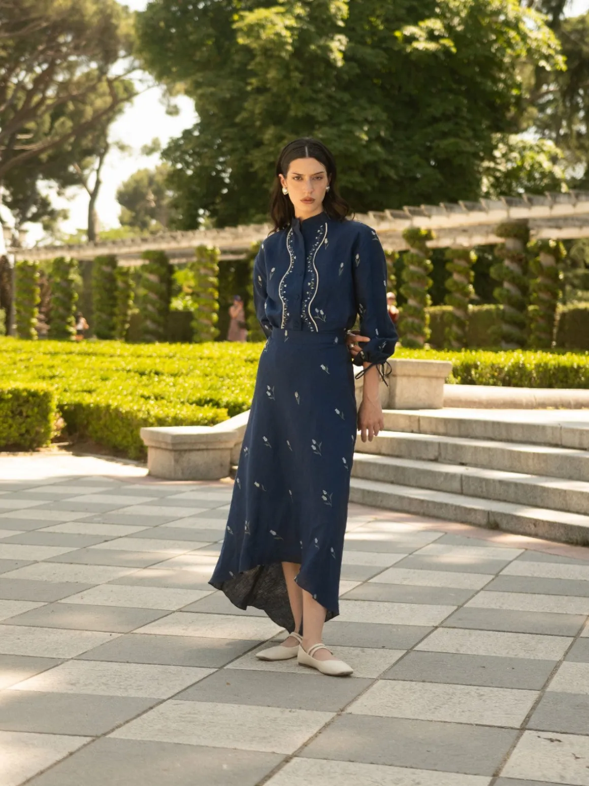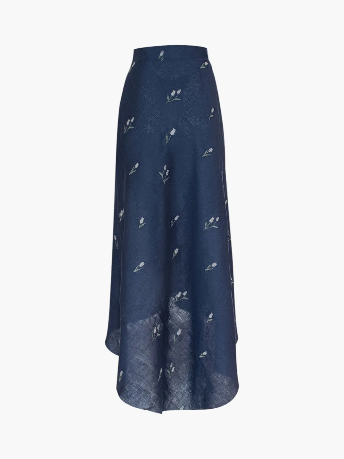 Our Estefania Lovely Tulip High-Low Skirt in Navy is a high low asymmetrical skirt with a flared silhouette. The skirt has a waistband that accentuates the waist and features embroidered lily details. Handcrafted in Colombia by female heads of households.