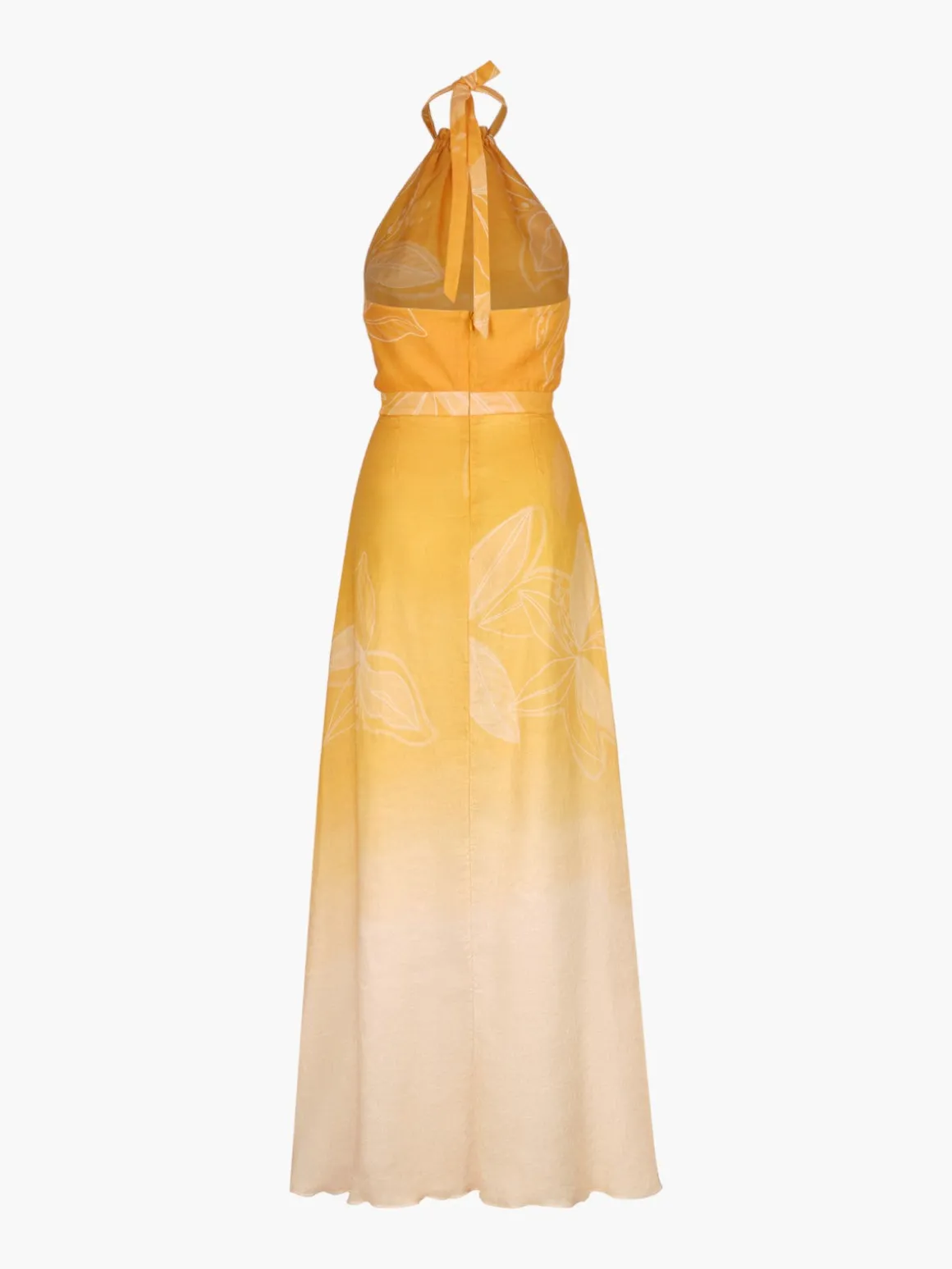 Ties at neck”}’ data-mce-fragment=”1″>Our Juan de Dios Magdalena Maxi Dress in Yellow is a sleeveless maxi dress with a high halter neckline that ties at the nape of the neck. Finished with an invisible zipper at back. Handcrafted in Colombia by female heads of households.
