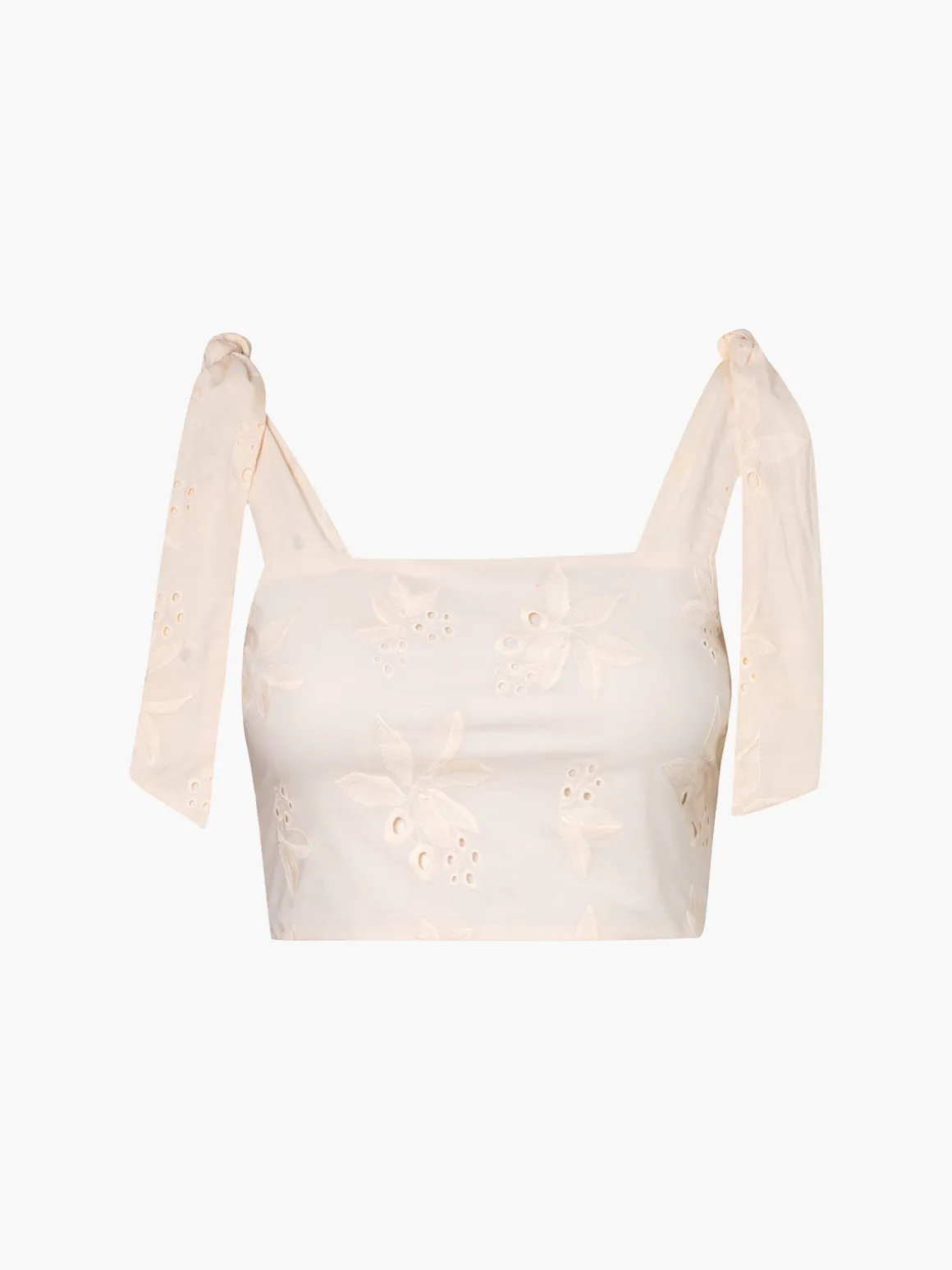 Our Juan de Dios Marimba Cotton Eyelet Top in Beige features a cropped silhouette with wide straps, ties on the shoulders, a square neckline, and a center back zipper. Handcrafted in Colombia by female heads of households.