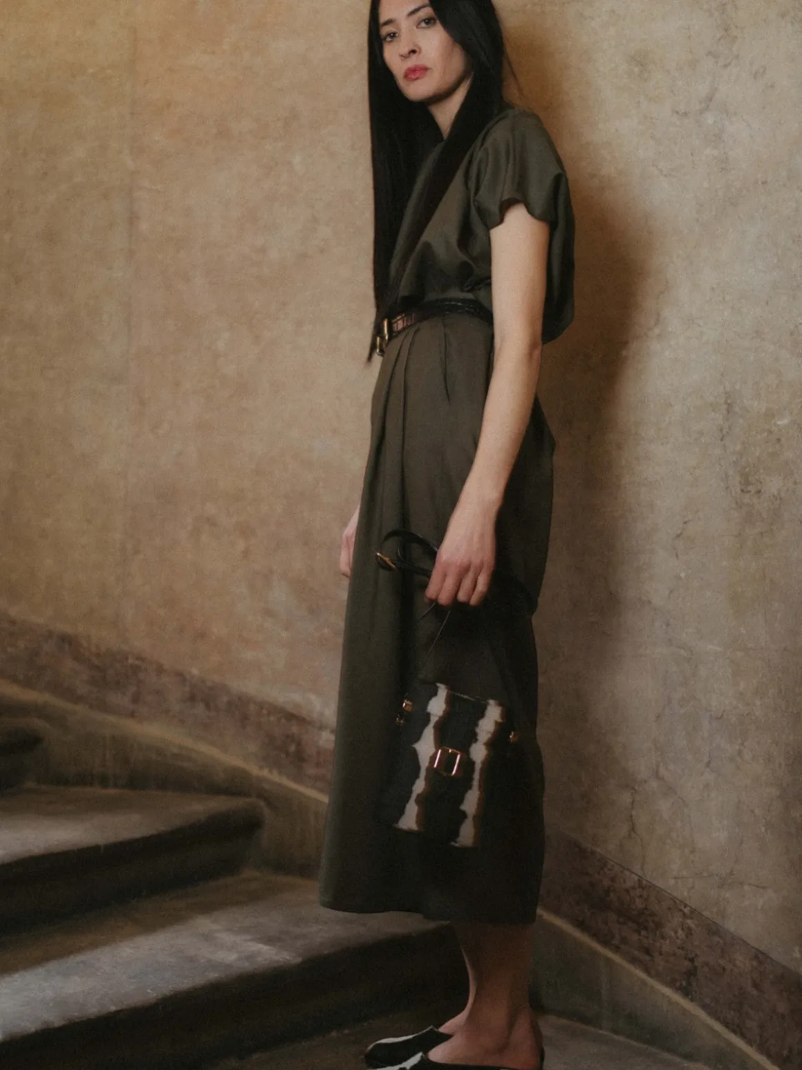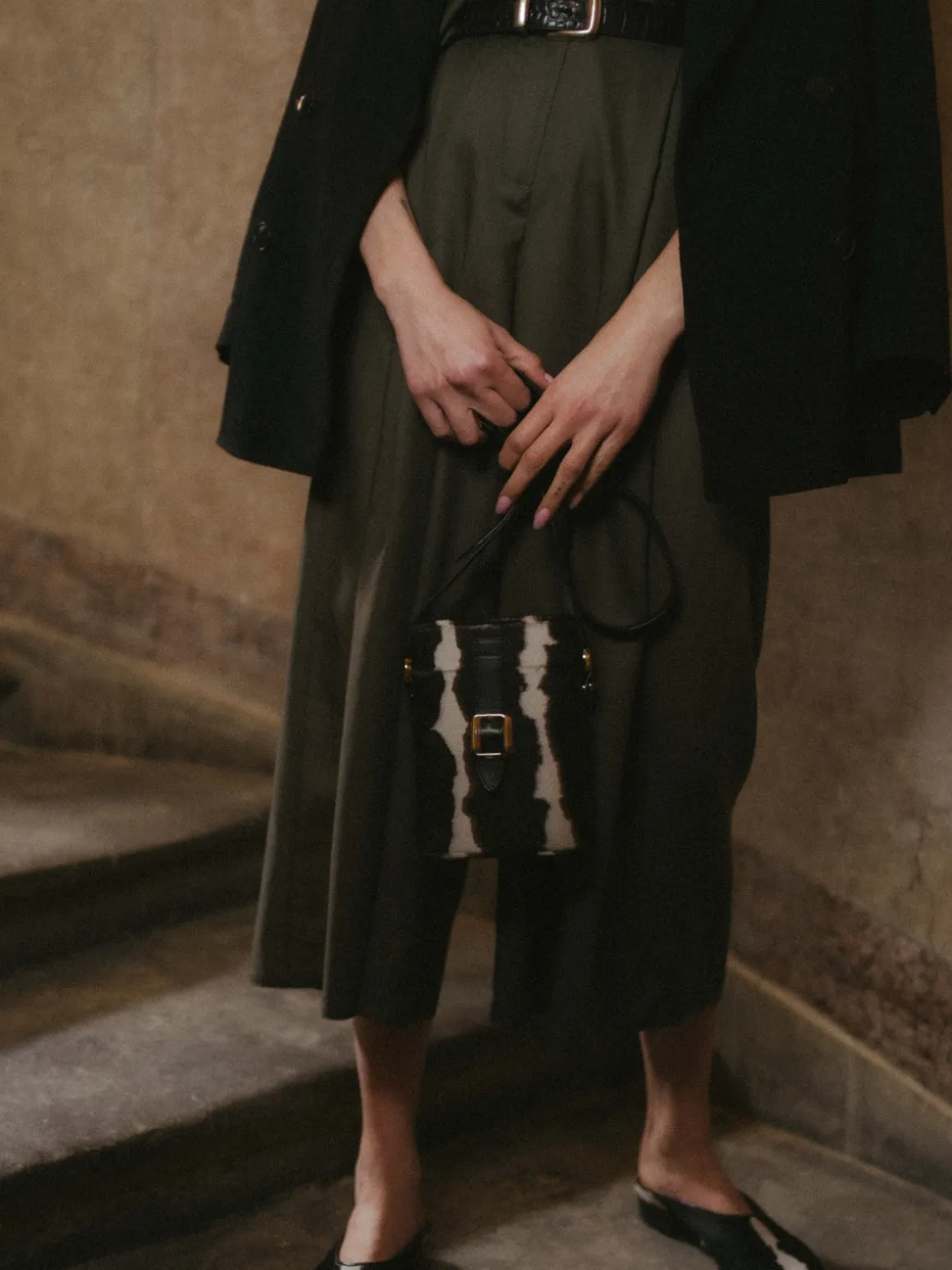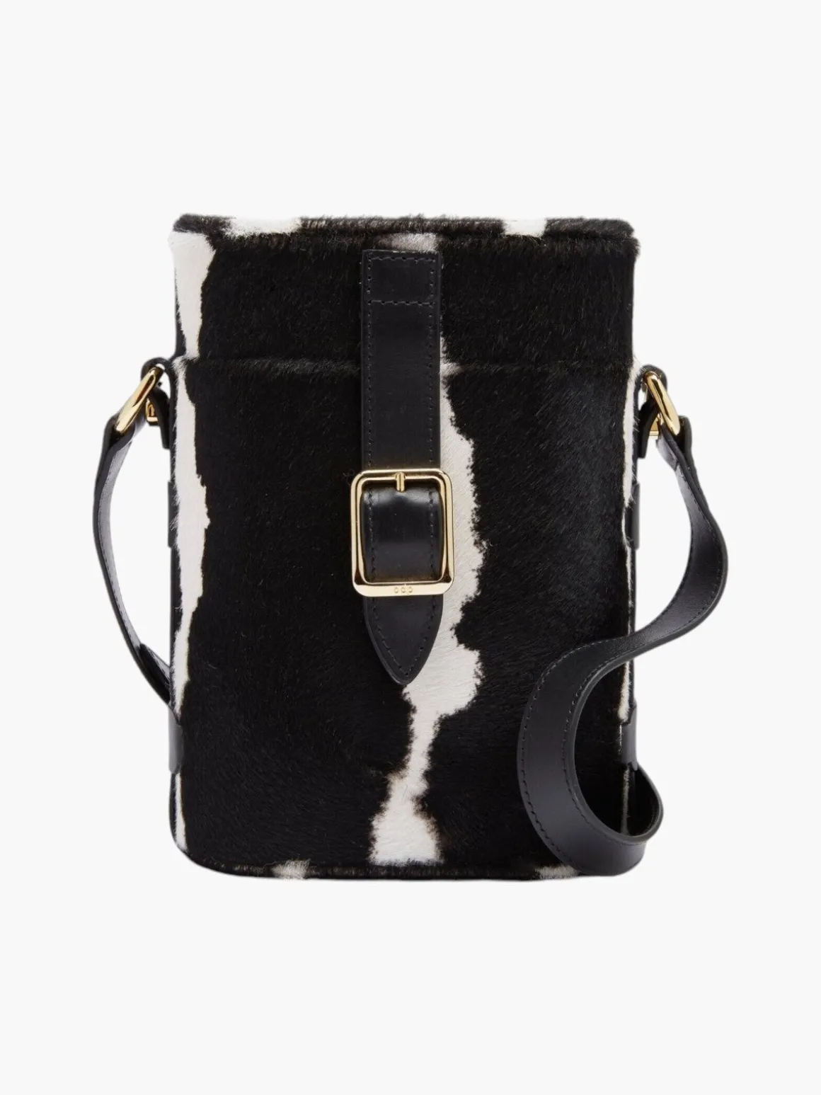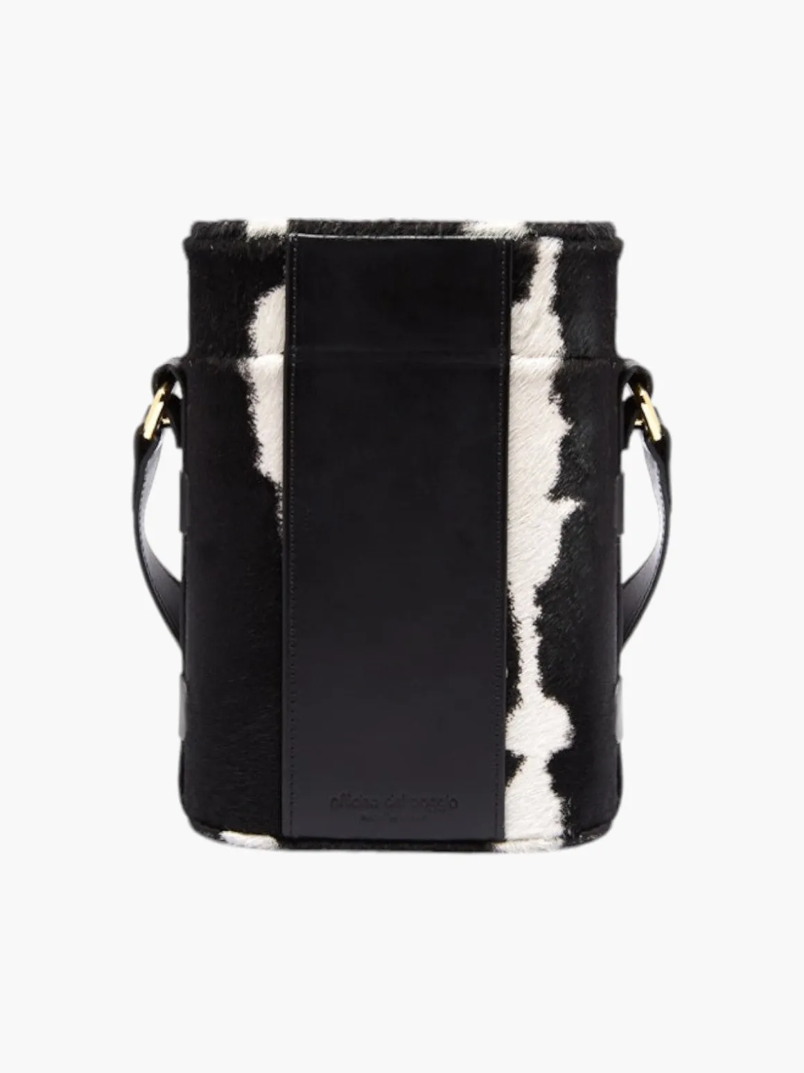 Our ODP Collection Mini Safari Bag in Black u0026amp; White Haircalf is a printed bag with a red suede lining. The bag has a snap button opening with gold-tone hardware. It can fit a phone, sunglasses, wallet, and more. Handcrafted by artisans in Italy.