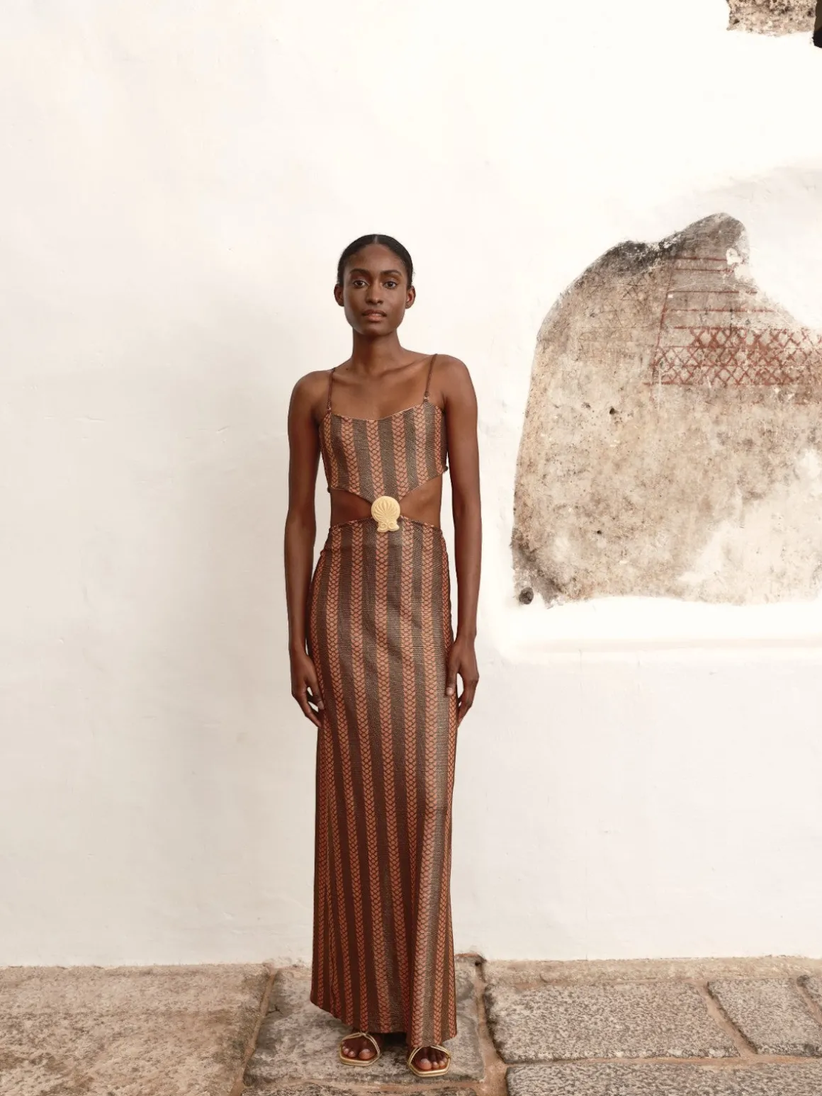 Our Juan de Dios Pestana Maxi Dress in Gold is a maxi length dress with front cut outs and a gold embellishment in the front. Handcrafted in Colombia by female heads of households.