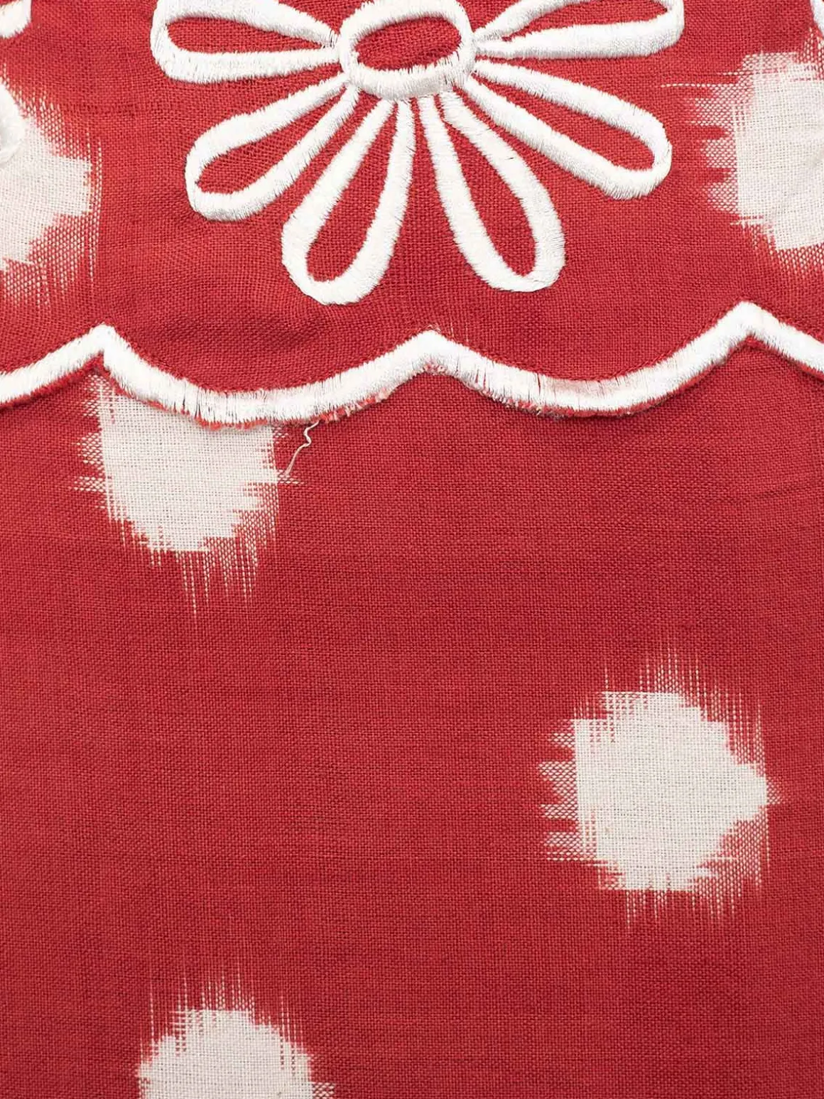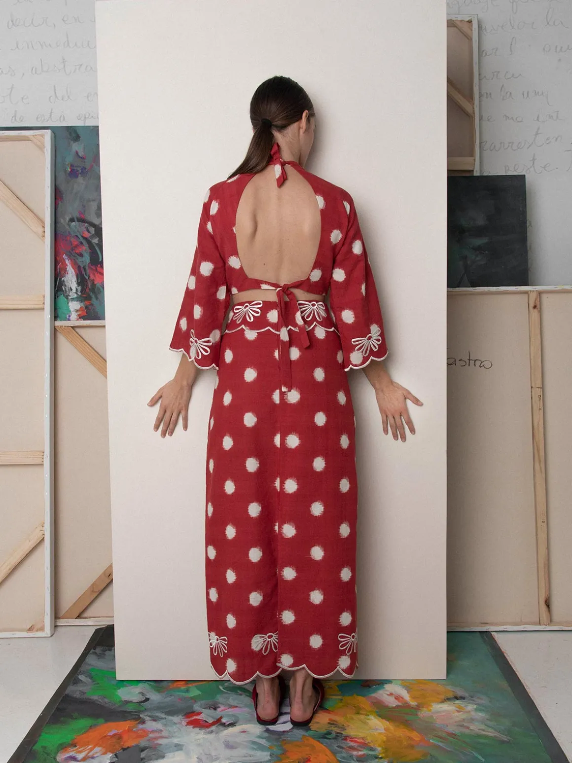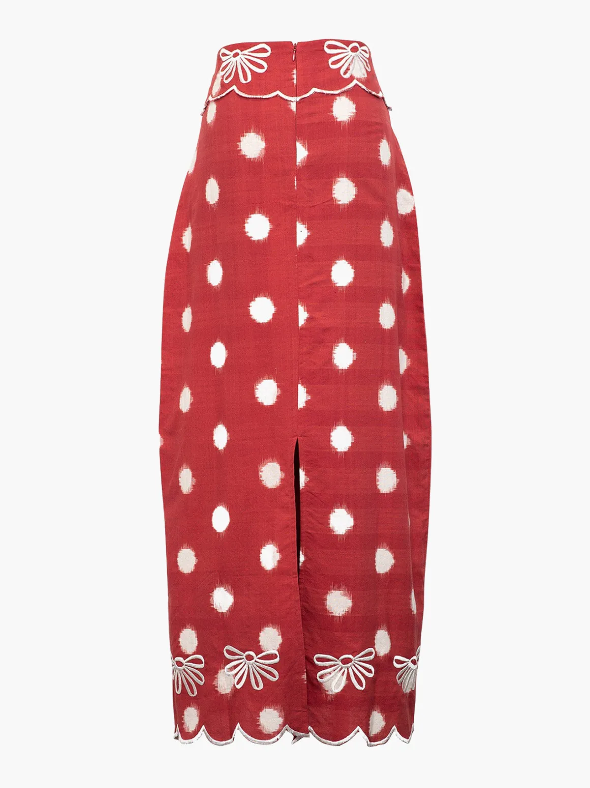 Our De Castro Polka Skirt features a slim silhouette with a high waistband, a scalloped hem, a zipper closure, and a center back slit. Handcrafted by artisans in India.
