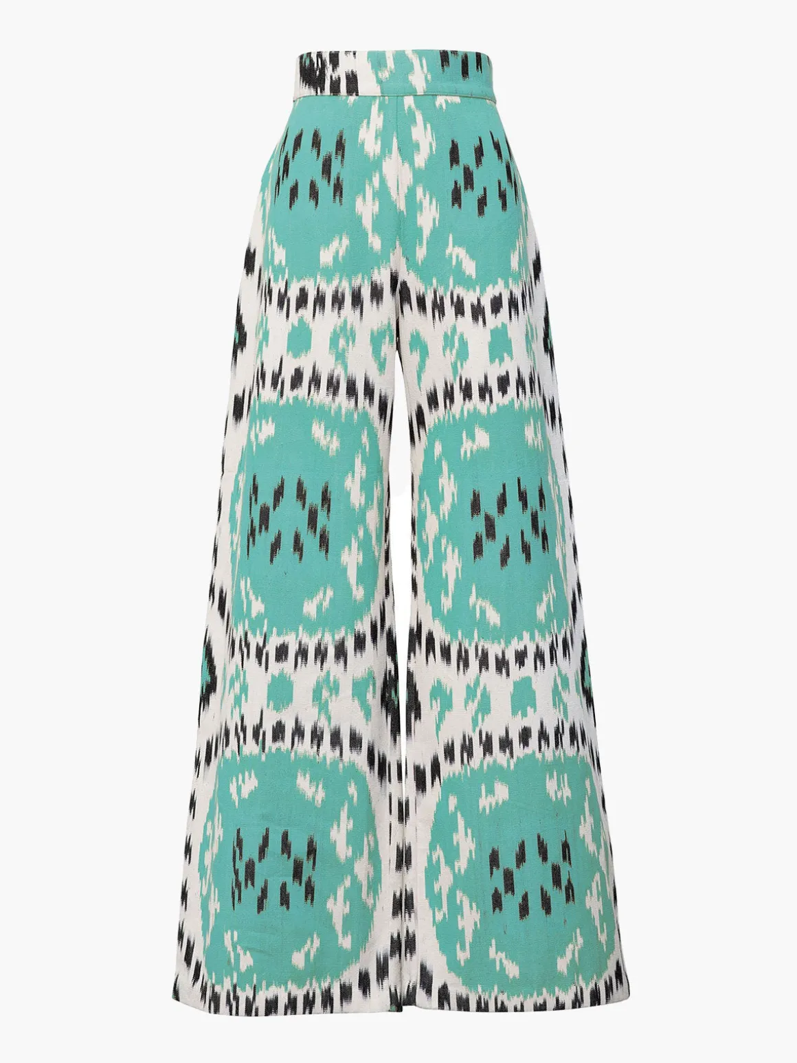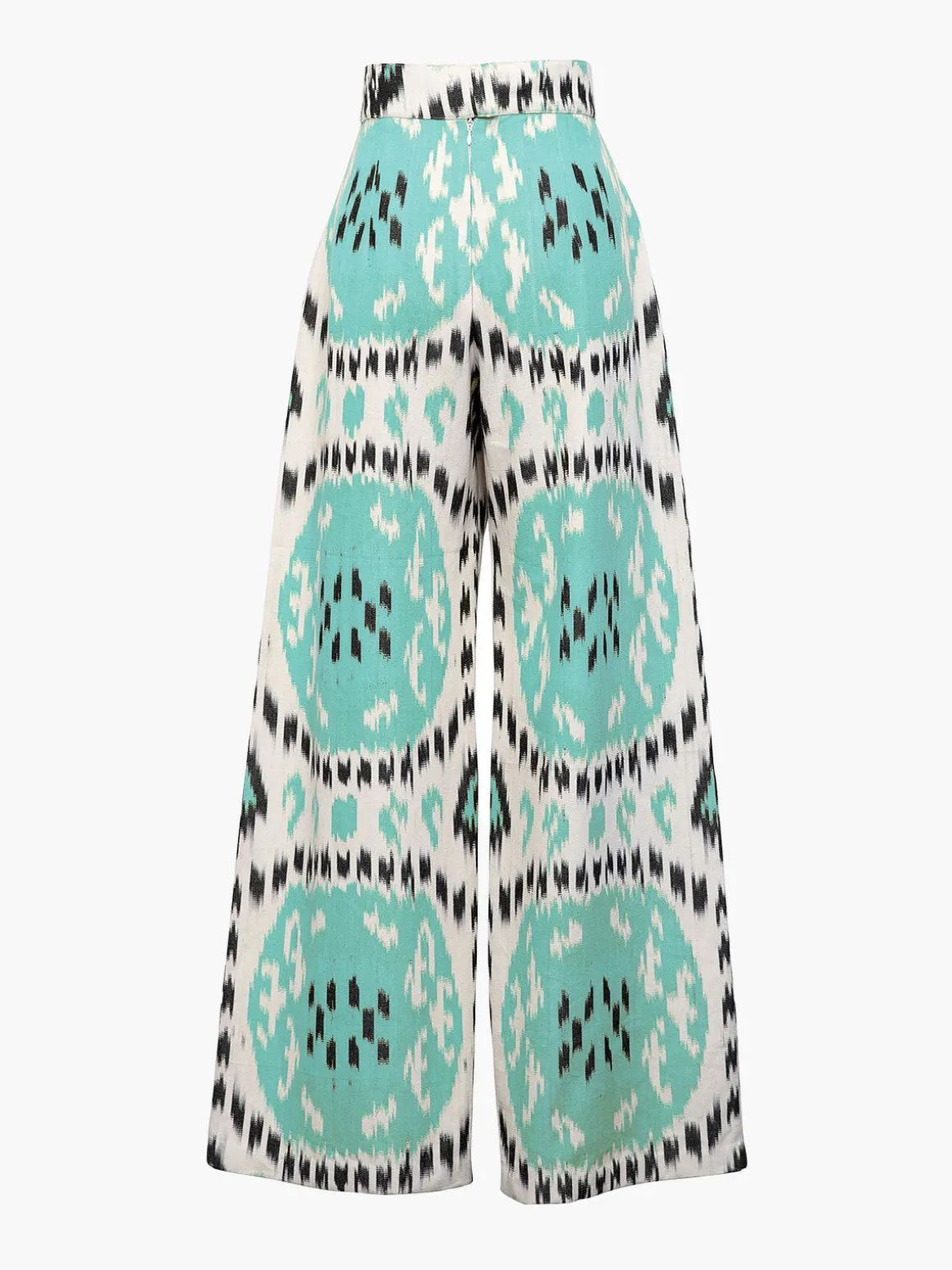 Our De Castro Rainbow Trousers in Aquamarine feature a flattering high waist fit in a wide leg silhouette. They’re finished with a center back zipper. Handcrafted by artisans in India.