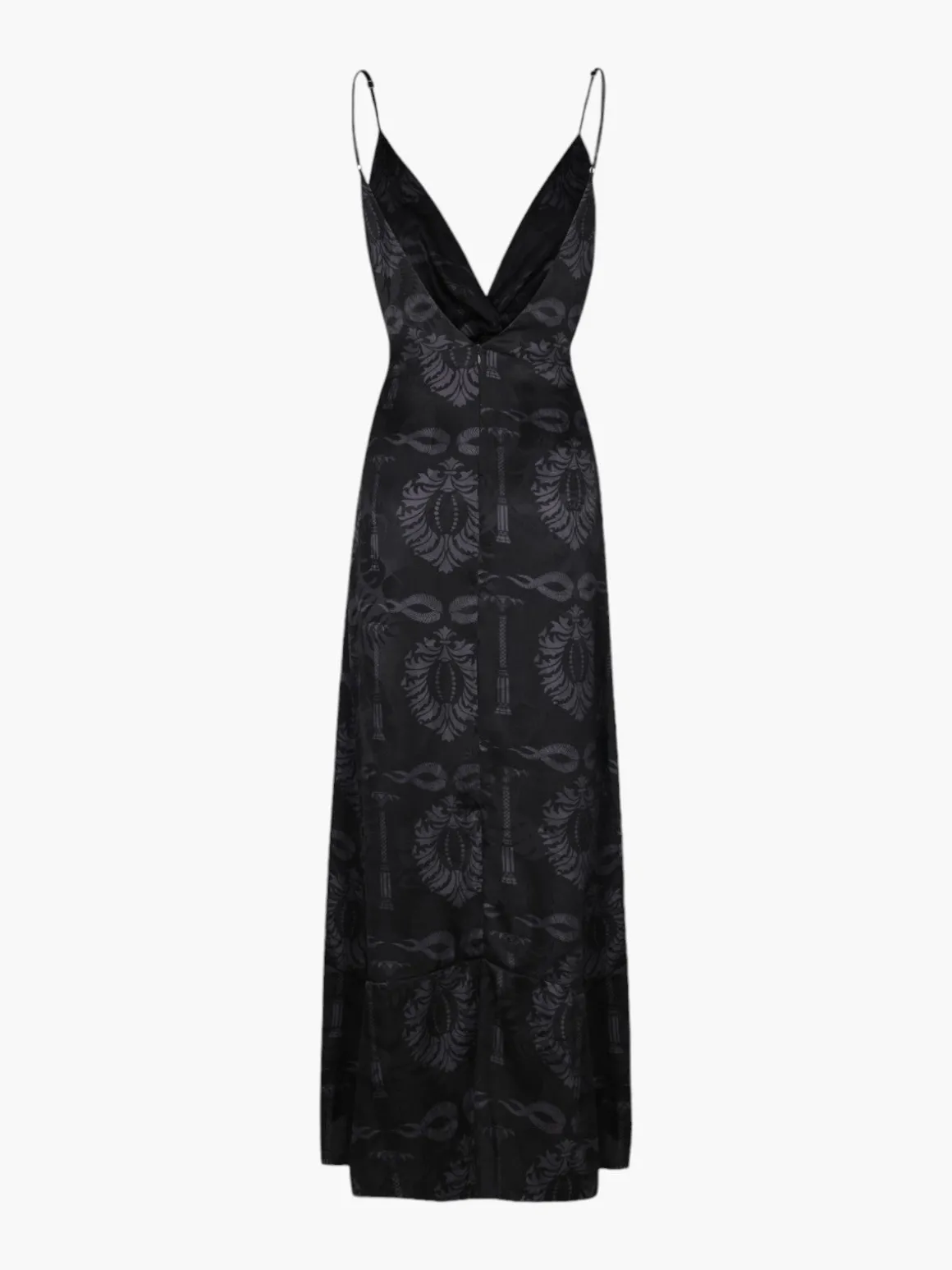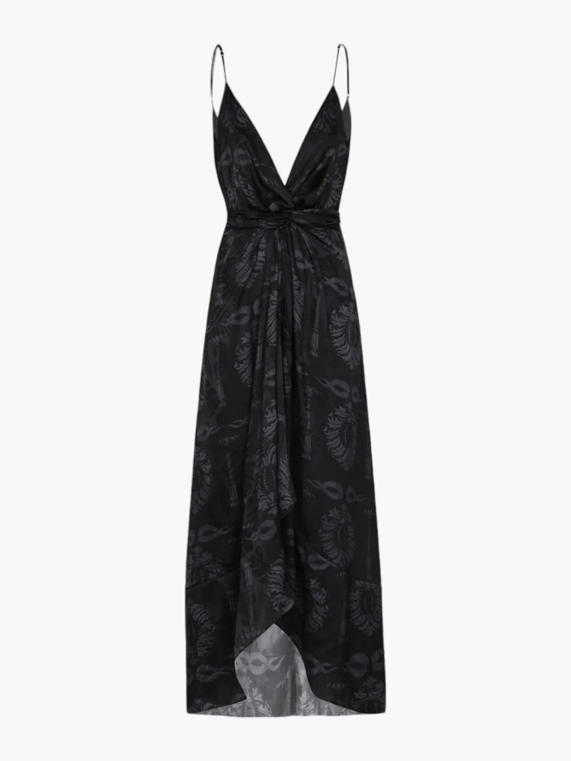 Our Juan de Dios Sabina Silk Jacquard Midi Dress in Black is a midi length dress with thin adjustable straps and a V-neckline. The front of the dress has a tie knot detail at the waist. Handcrafted in Colombia by female heads of households.