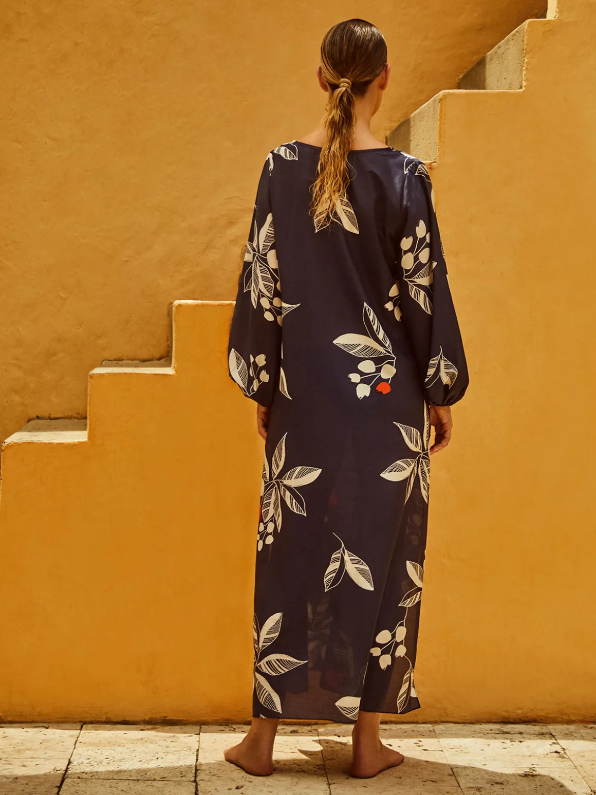 Our Juan de Dios San Marco Cotton Silk Midi Dress in Dark Blue is effortless in a loose silhouette with long blouson sleeves, a V-neckline, and side slits. Handcrafted in Colombia by female heads of households.