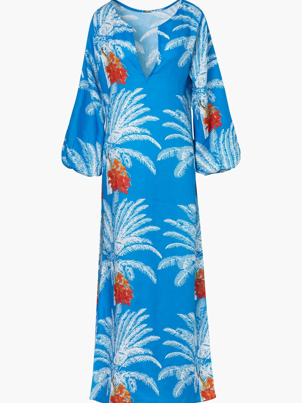 Our Juan de Dios San Marco Linen Maxi Dress in Turquoise Palms is effortless in a loose silhouette with long blouson sleeves, a V-neckline, and side slits. Handcrafted in Colombia by female heads of households.