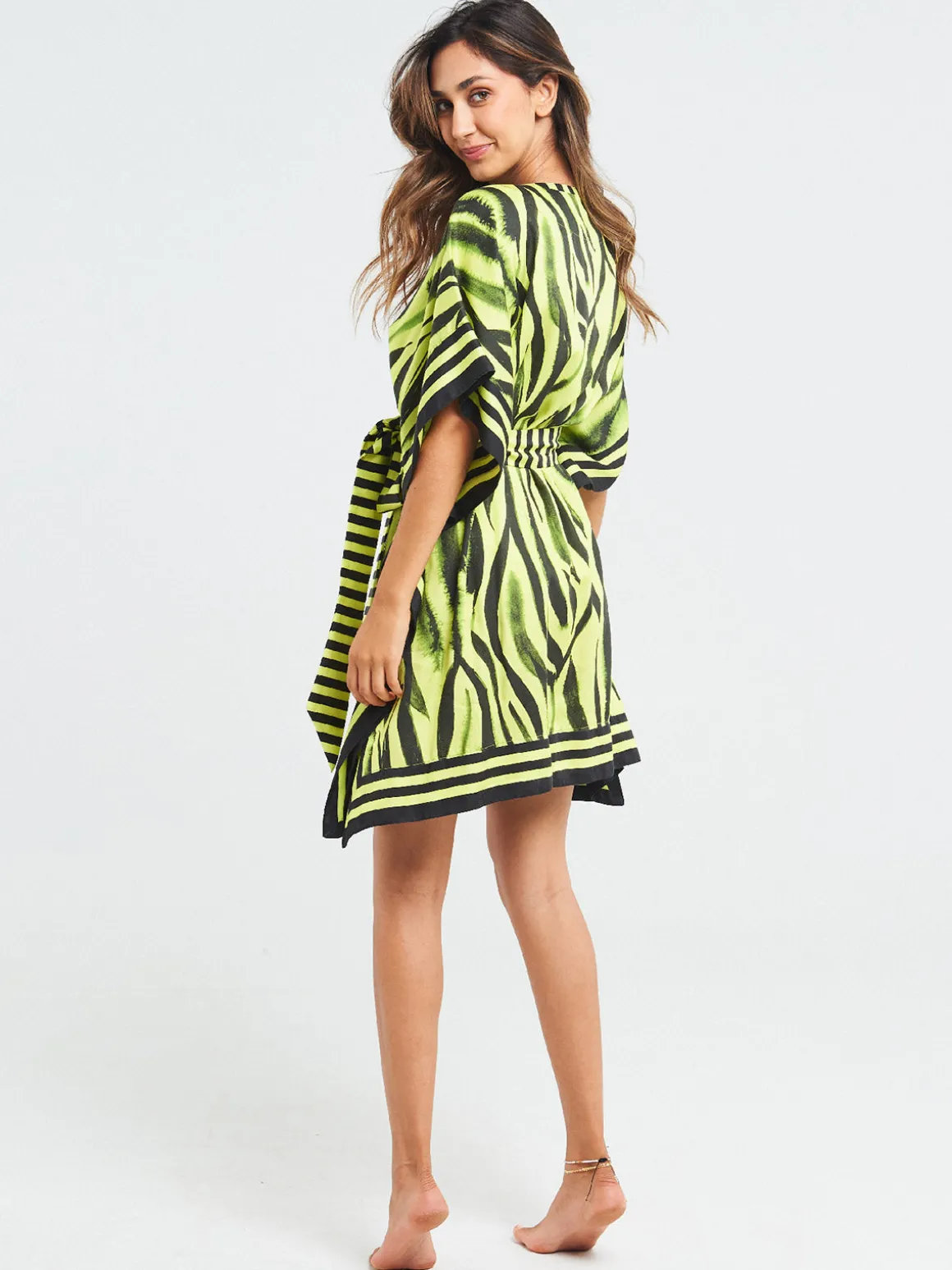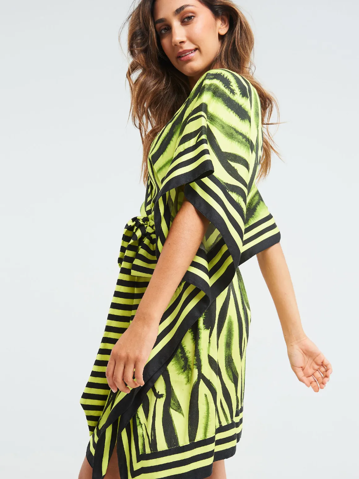 Our Sigal Neon Zebra Short Kimono features a relaxed silhouette with short, wide sleeves, an open front, and a tie belt to close it at the waist. Wear as a swimsuit coverup or a casual wrap dress. Handcrafted in India featuring hand-drawn designs digitally printed to cut water waste and reduce overproduction.