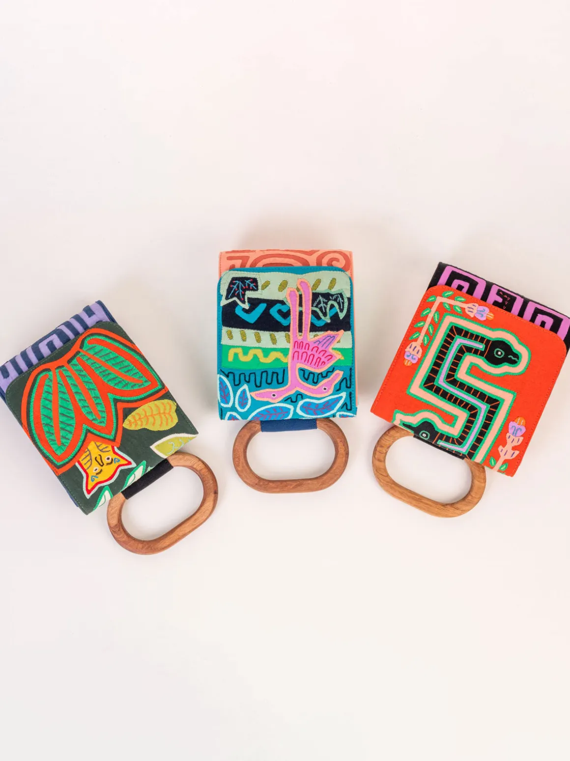 Our Mola Sasa Sigwi Mini Bag boasts a petite flap-top silhouette with a combination of contrasting handwoven and appliqued patterns. Finished with a magnetic closure, an oval wooden top handle, and an optional leather strap for carrying over the shoulder or across the body. Handcrafted by artisans in Bogota, Colombia from textiles sewn by the women of the Guna Dule community.