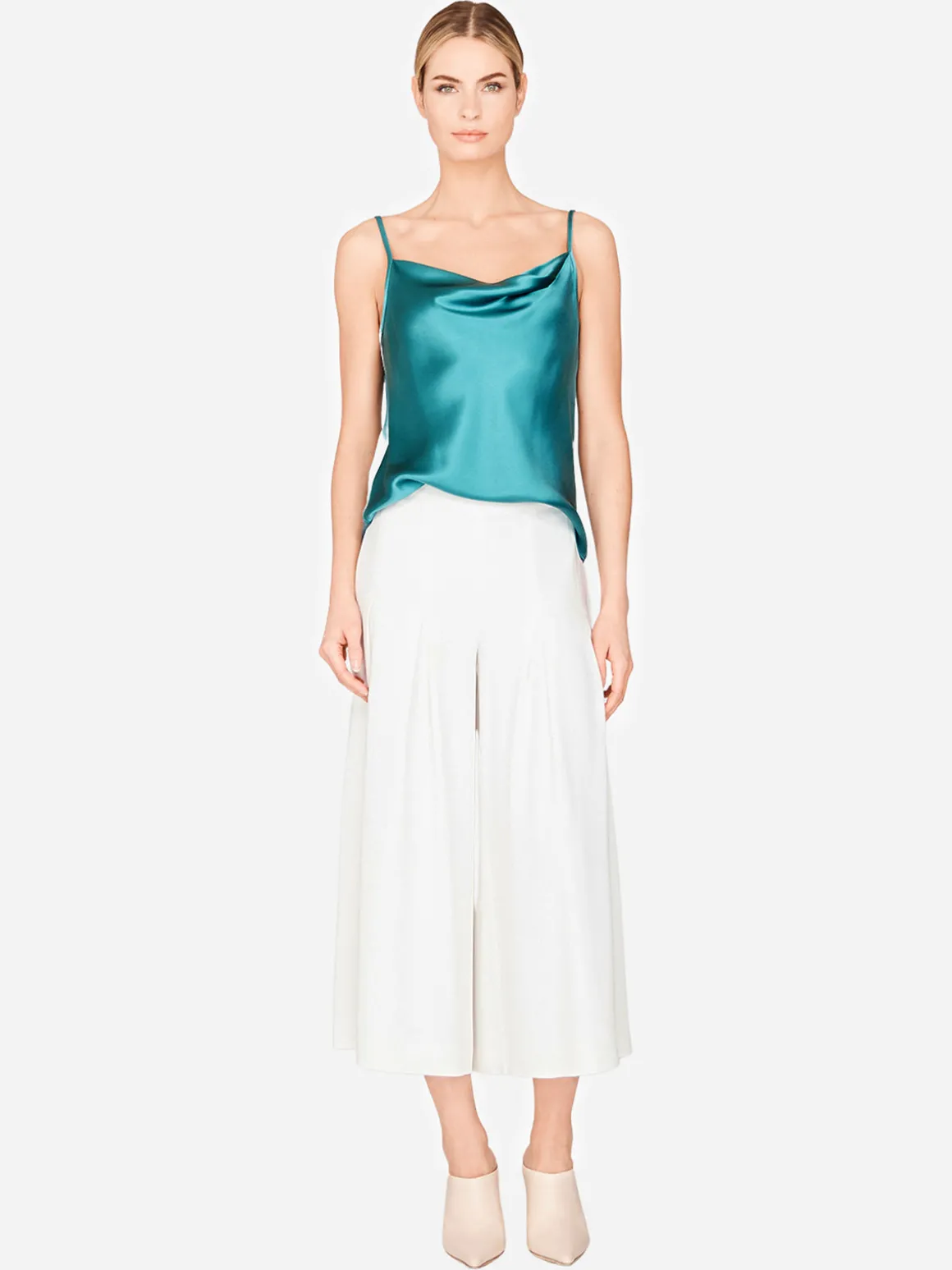 Our Mi Jong Lee Stretch Base Wide Pleated Pants With Side Zip feature a flattering wide leg silhouette with a high waist, a cropped hem, and a side zipper closure. Handcrafted by artisans in New York City.
