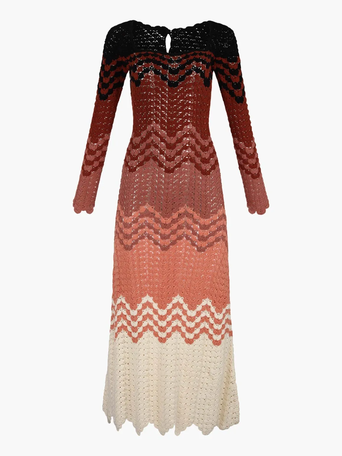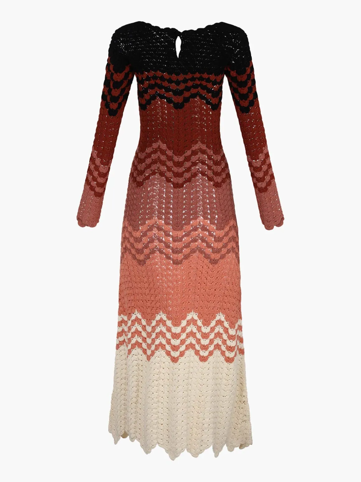 Our ESCVDO Sumac Maxi Dress is handmade out of crochet in hues of pinks and browns. The pattern is unique and the perfect summer dress. Handcrafted by Linda Chaupe and her collective Manos Monas, in Lima, Peru.