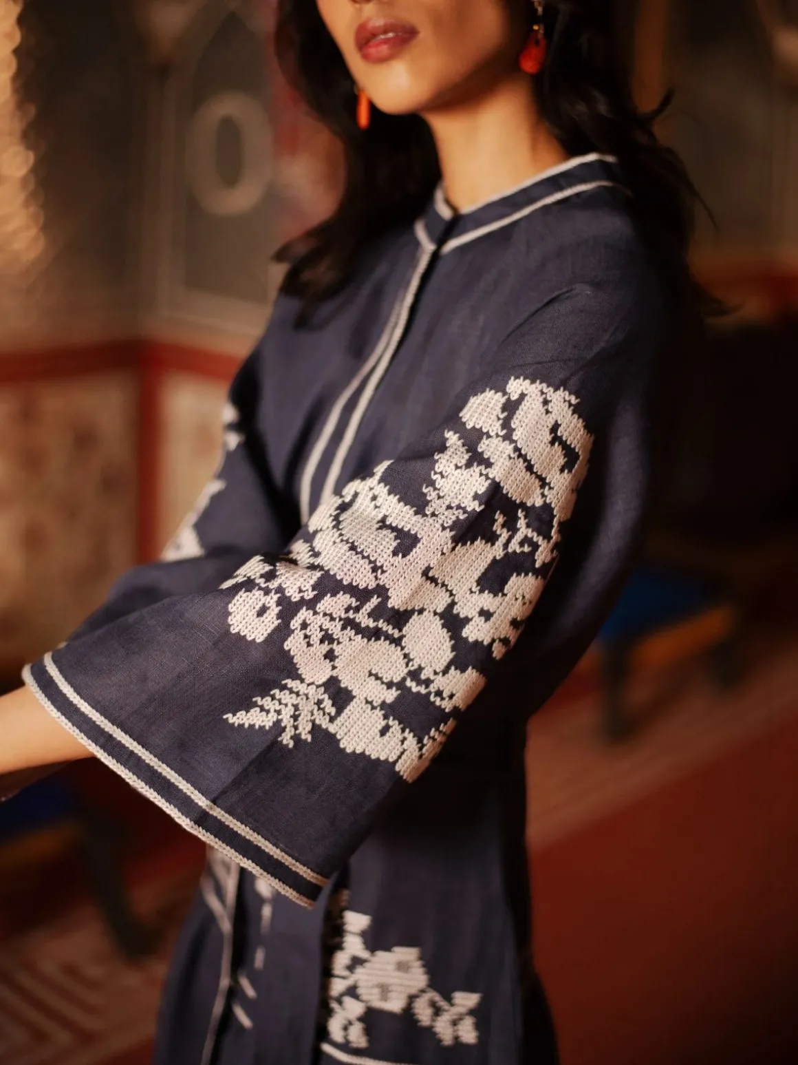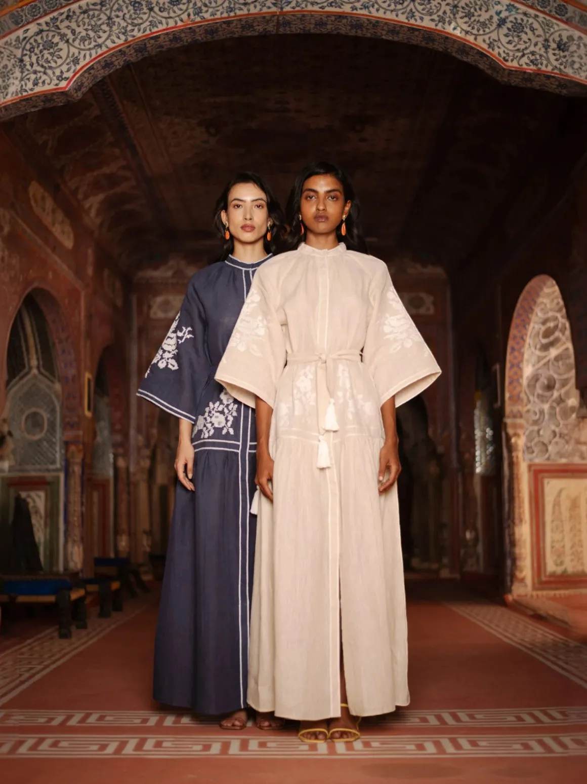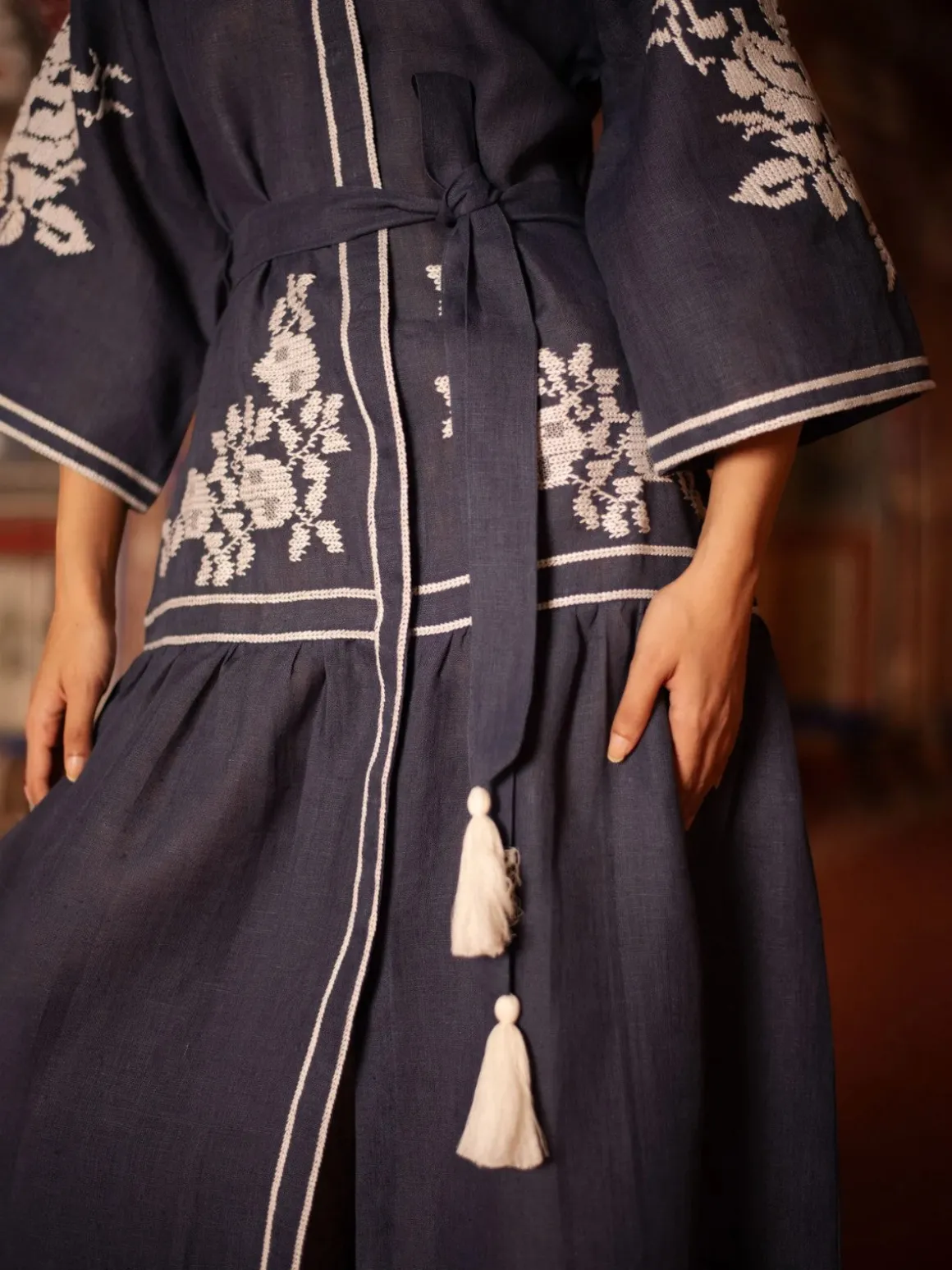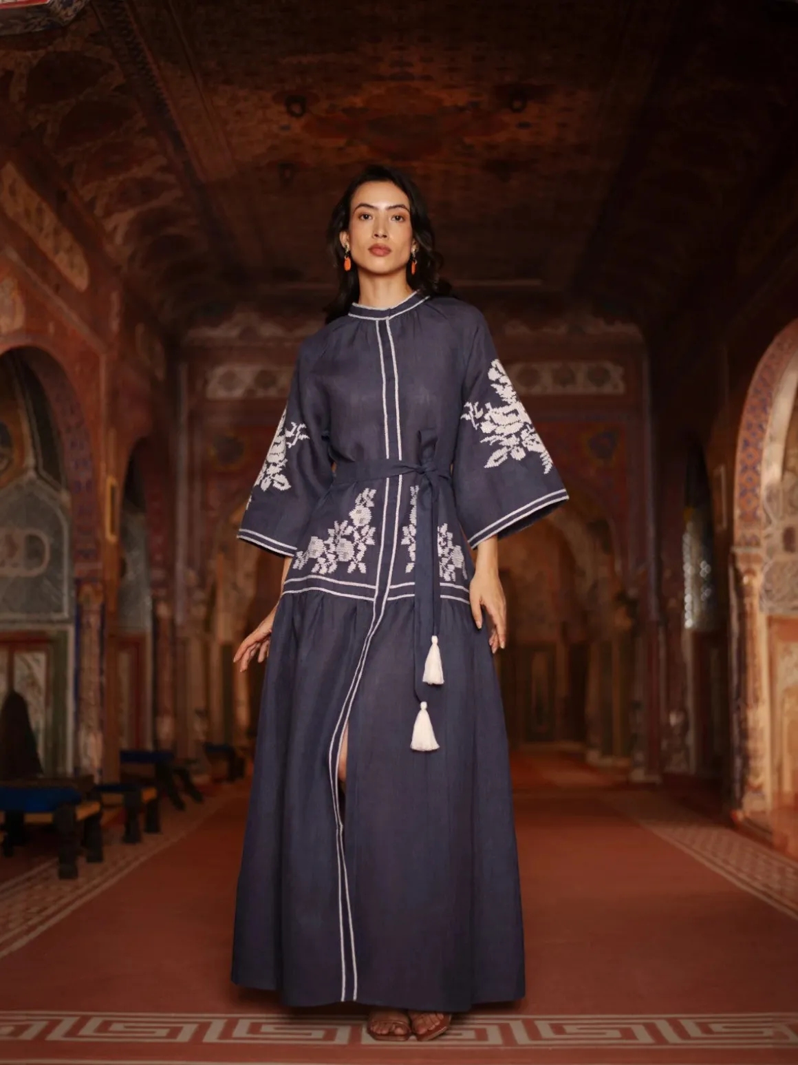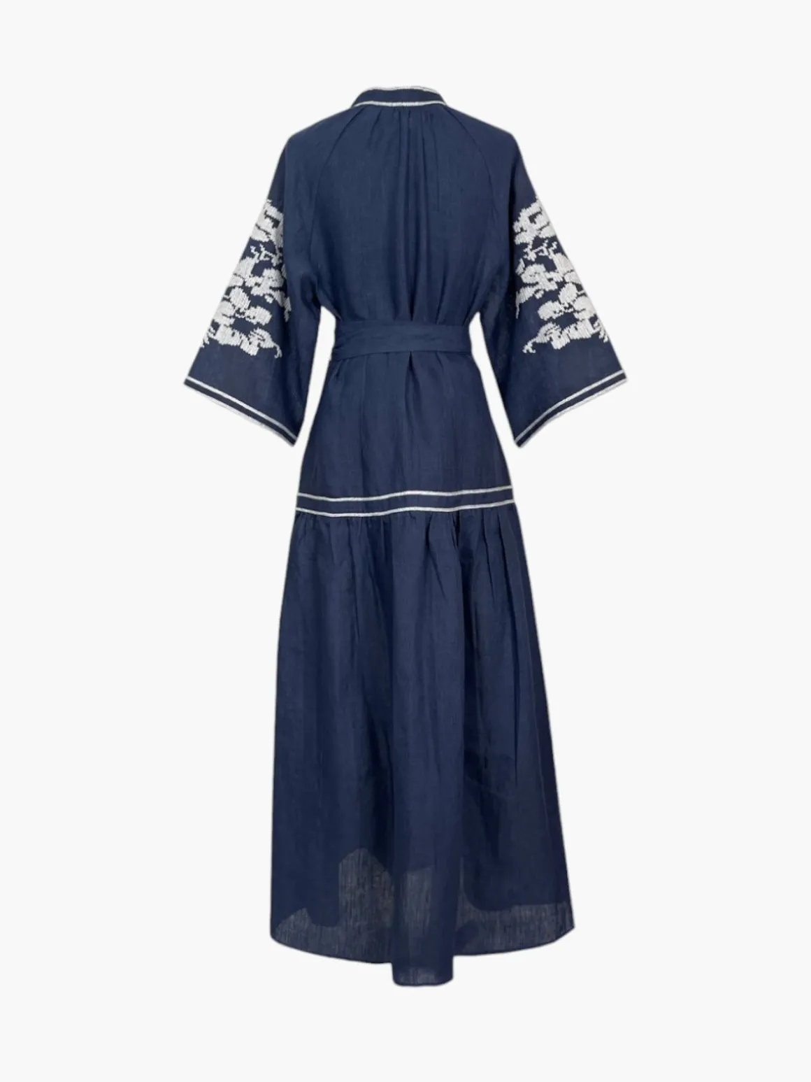 Our De Castro Swan Dress in Navy features contrasting white embroidery, hidden front buttons, bell shaped raglan sleeves and tasseled belt. Handcrafted by artisans in India.