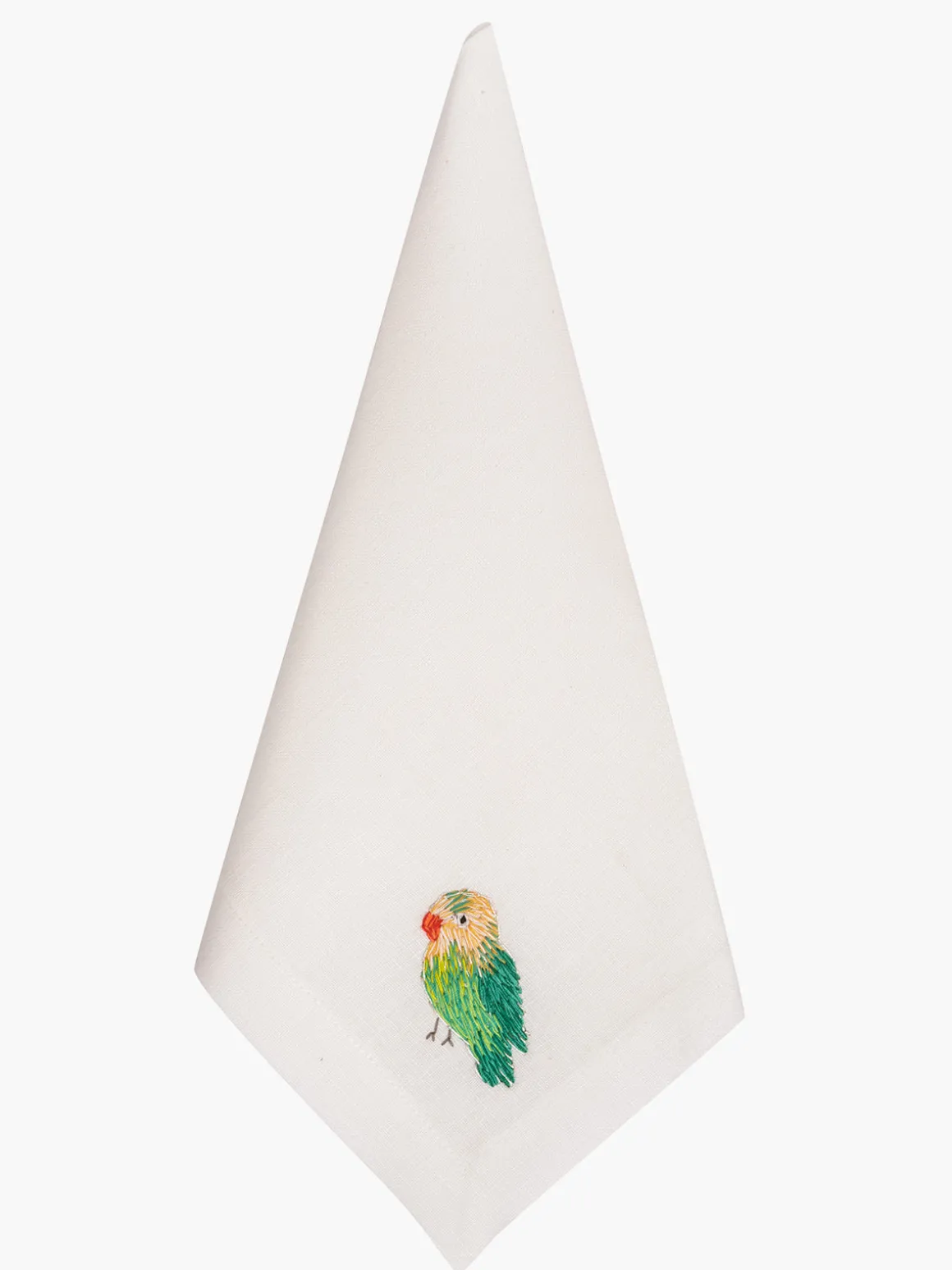 Our Francesca Miranda Table Napkins Set of 4 in Parakeet includes four matching napkins, each of which is hand-embroidered with a distinctive graphic in the corner. Handcrafted by artisans in Colombia.
