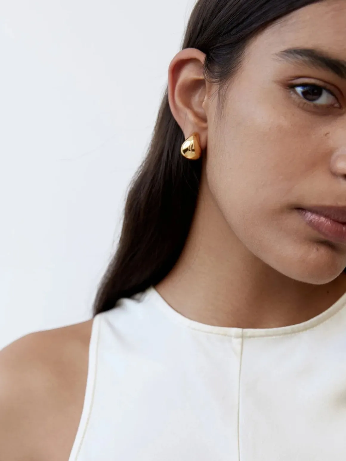 Our ESSEN Drop Earrings in Gold are a fusion of organic and refined. Handcrafted by artisans in Italy from 100% recycled and locally sourced 18ct gold vermeil.