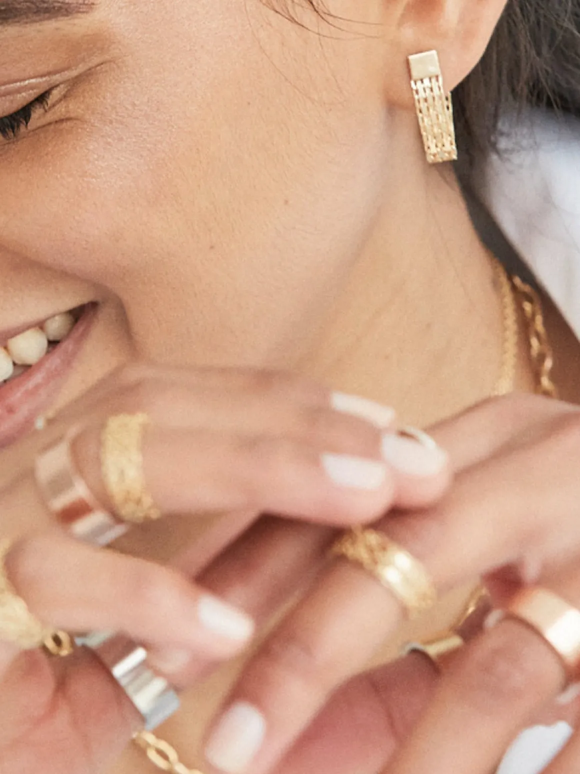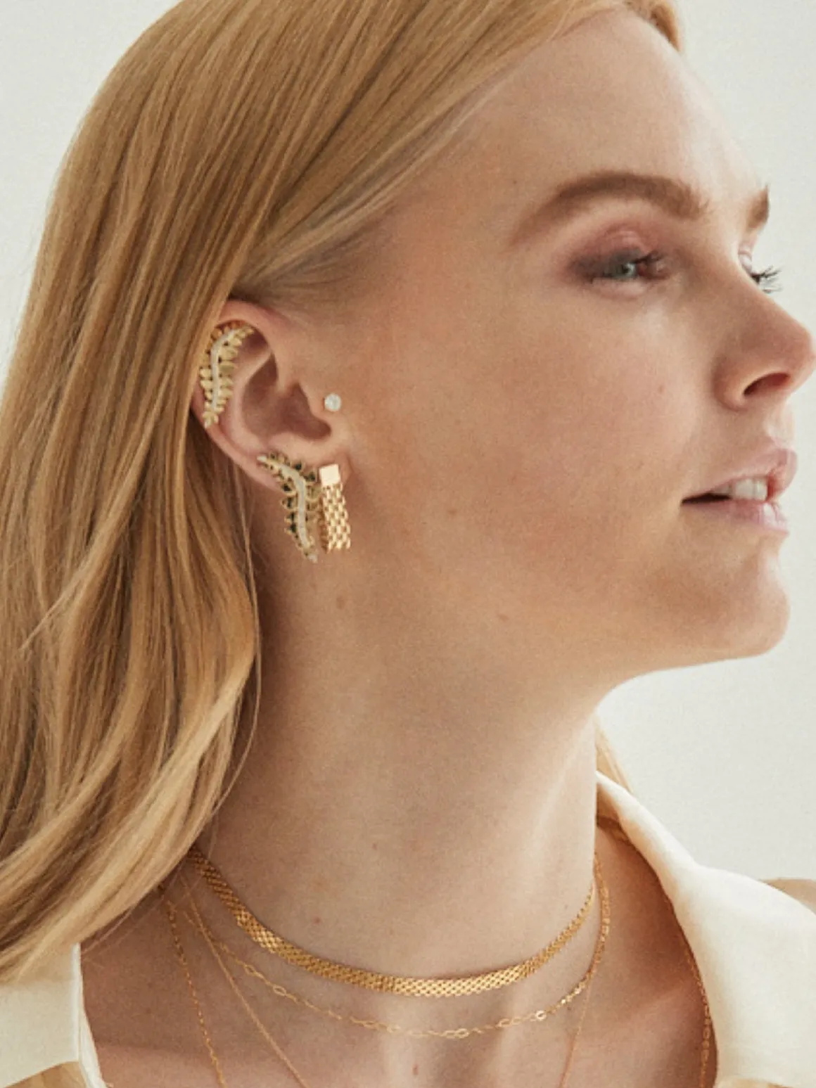 Our KBH Jewels Triple Bismark Loops feature a drop design made from flexible gold mesh with an ear nut bullet back. Handcrafted by artisans in NYC.