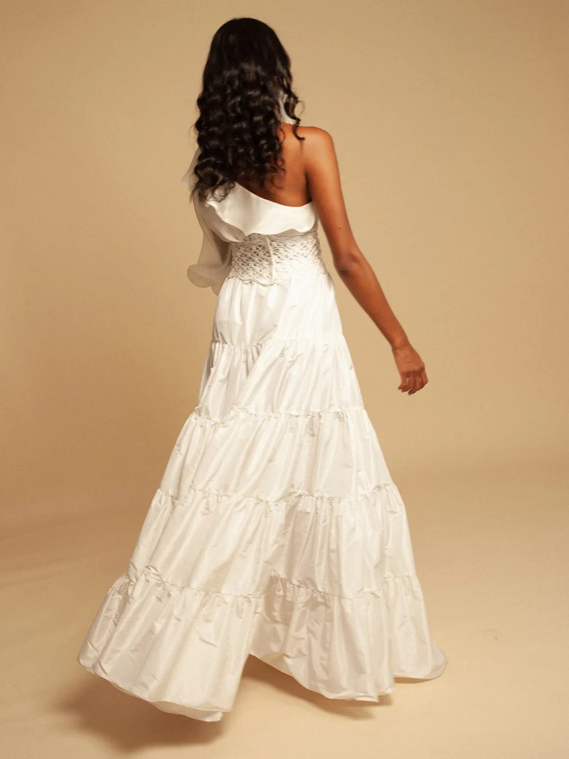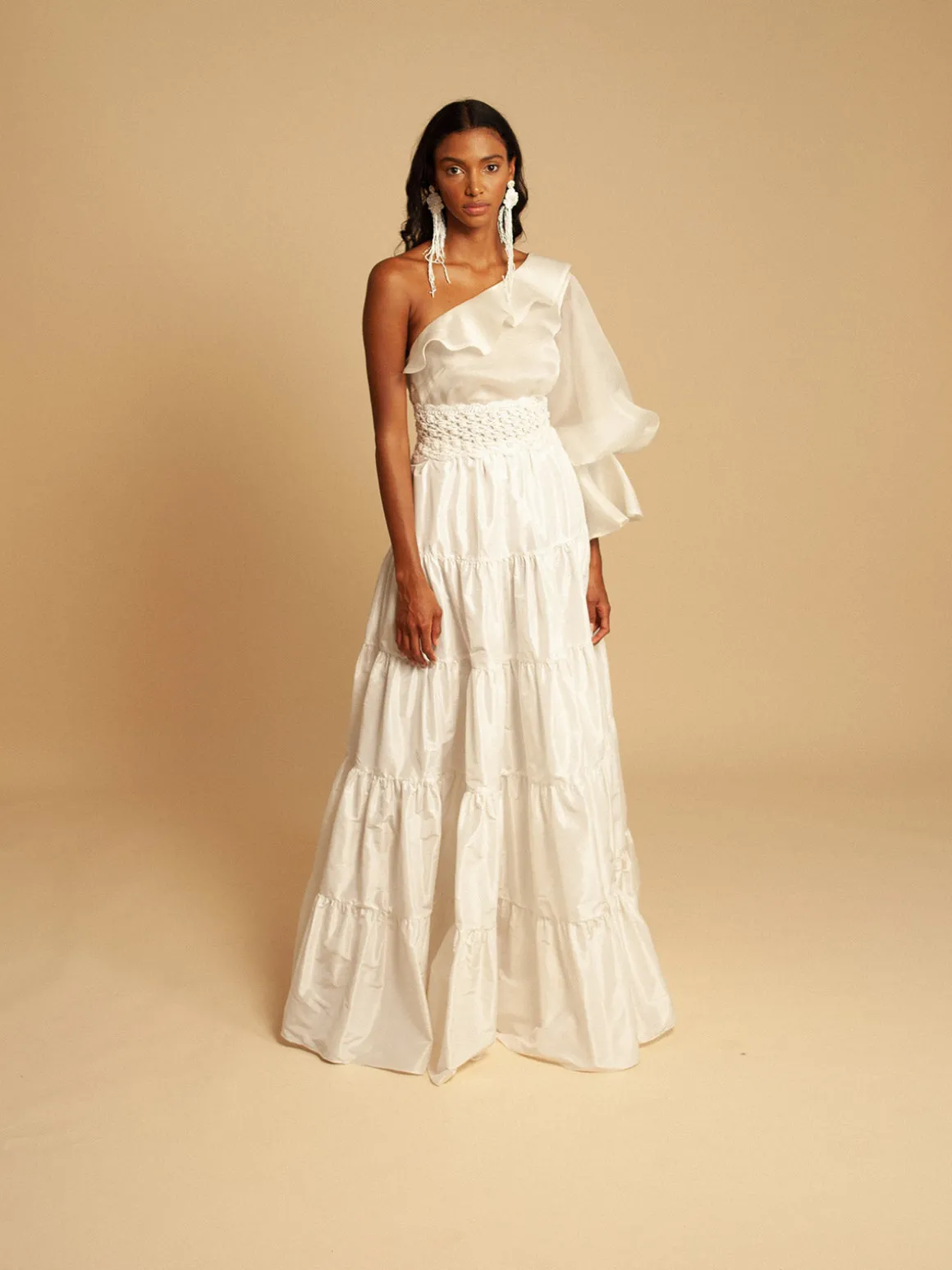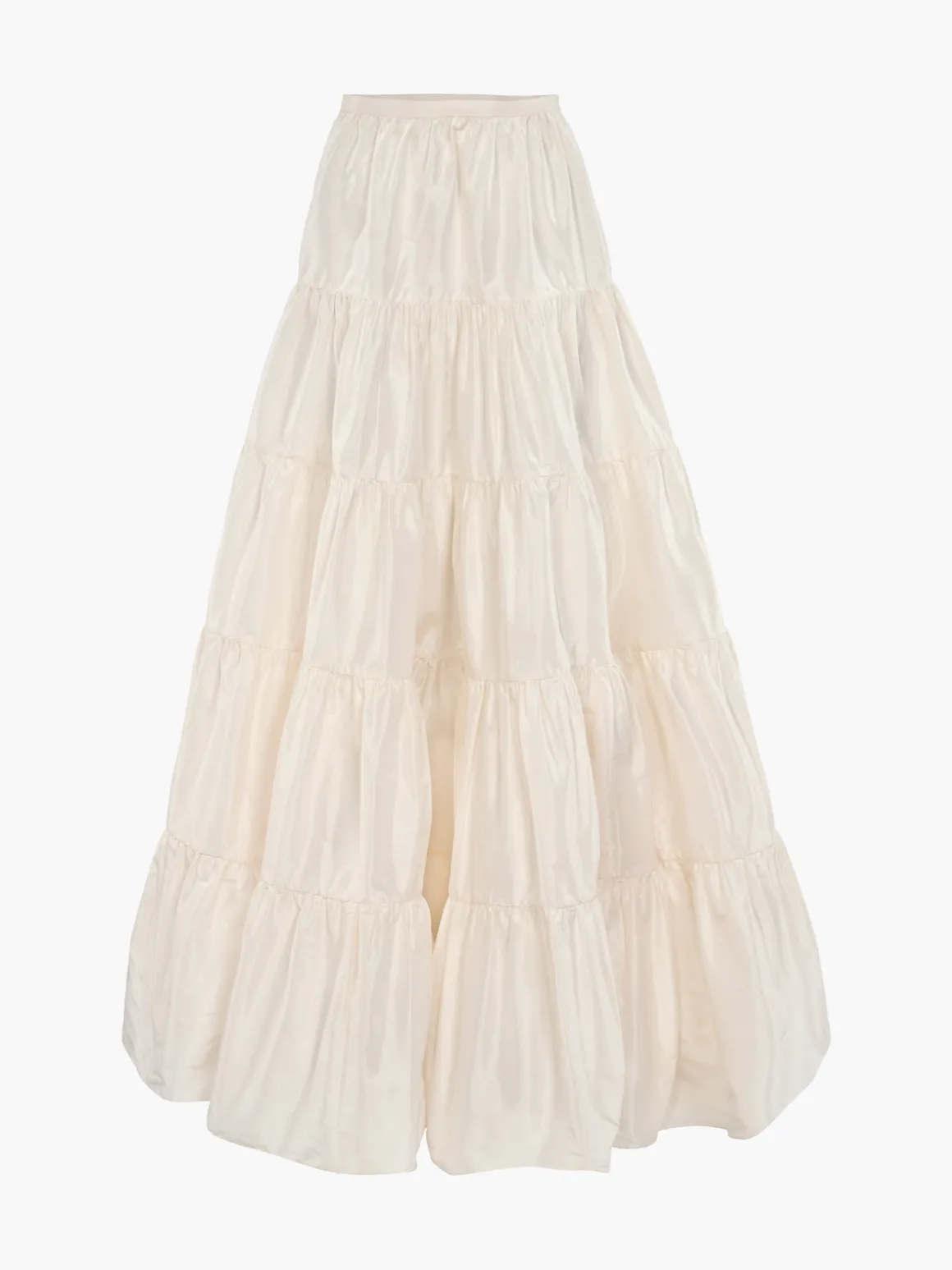 Our Francesca Miranda Venus Skirt boasts volume and structure in a full length A-line silhouette with tiered panels and a side zipper closure. Handcrafted in Colombia by female heads of households.