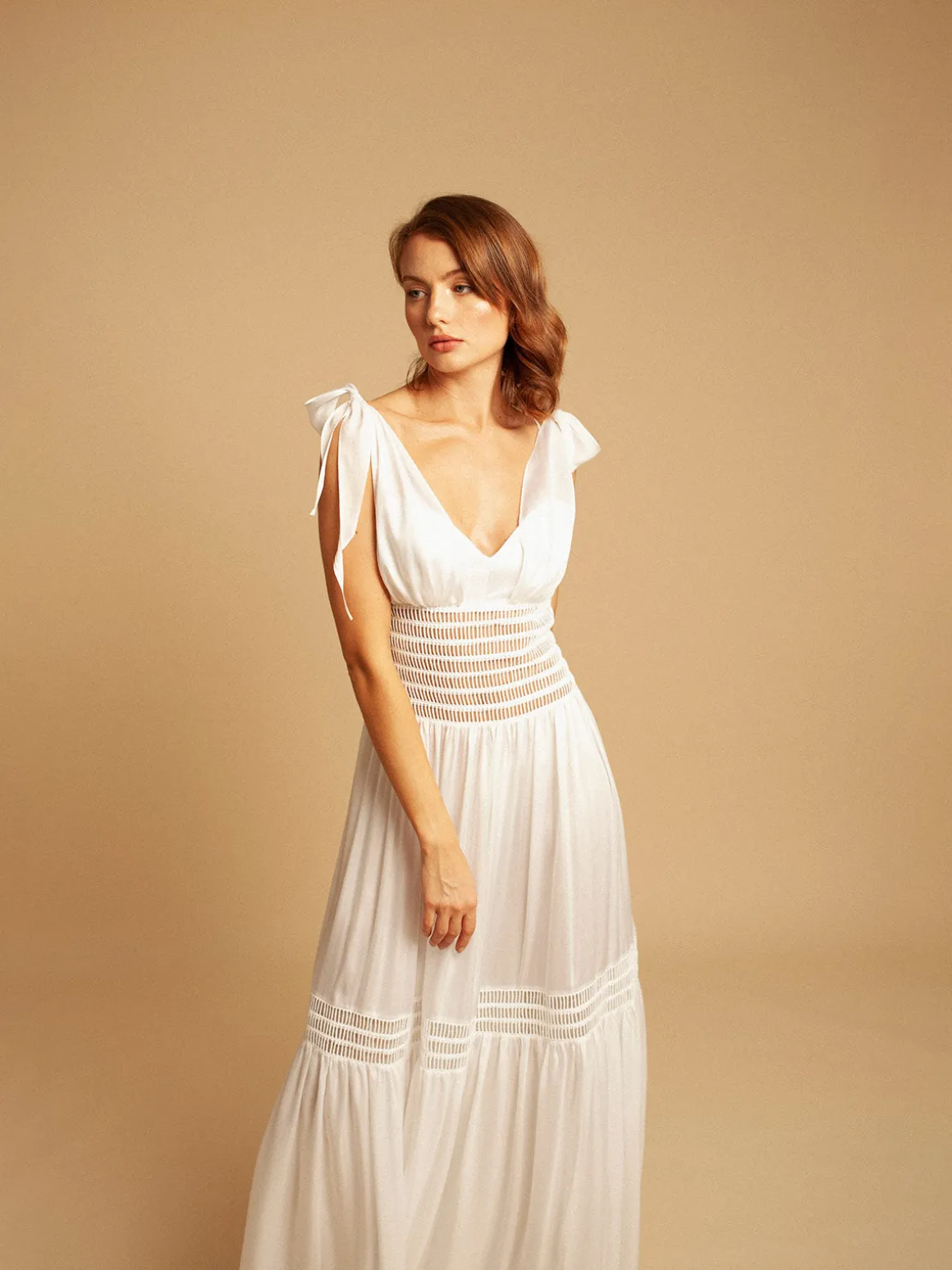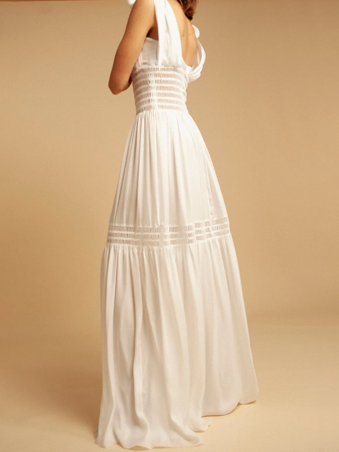 Our Francesca Miranda Veta Dress features an A-line silhouette with a sleeveless bodice, tie shoulder straps, a V-neckline, a wide waistband, and ladder stitched details. Finished with a zipper closure in back. Handcrafted in Colombia by female heads of households.