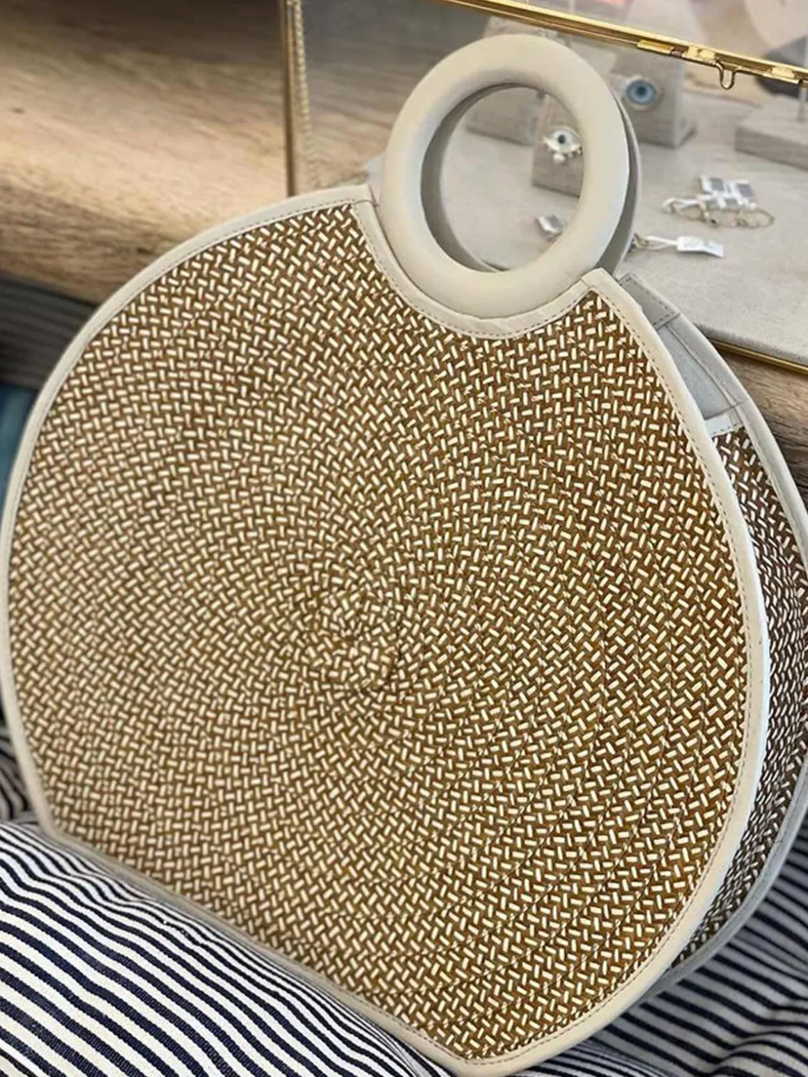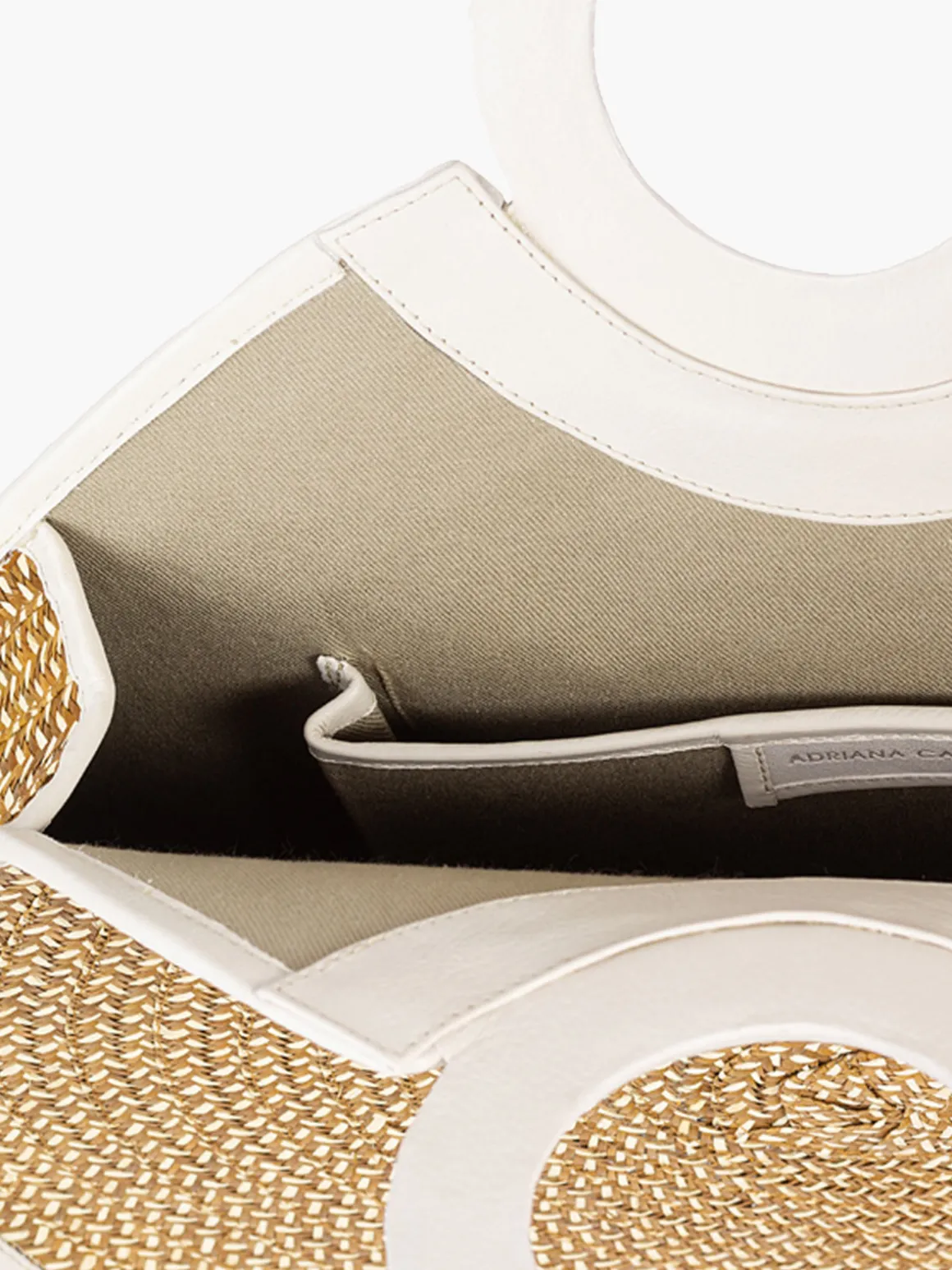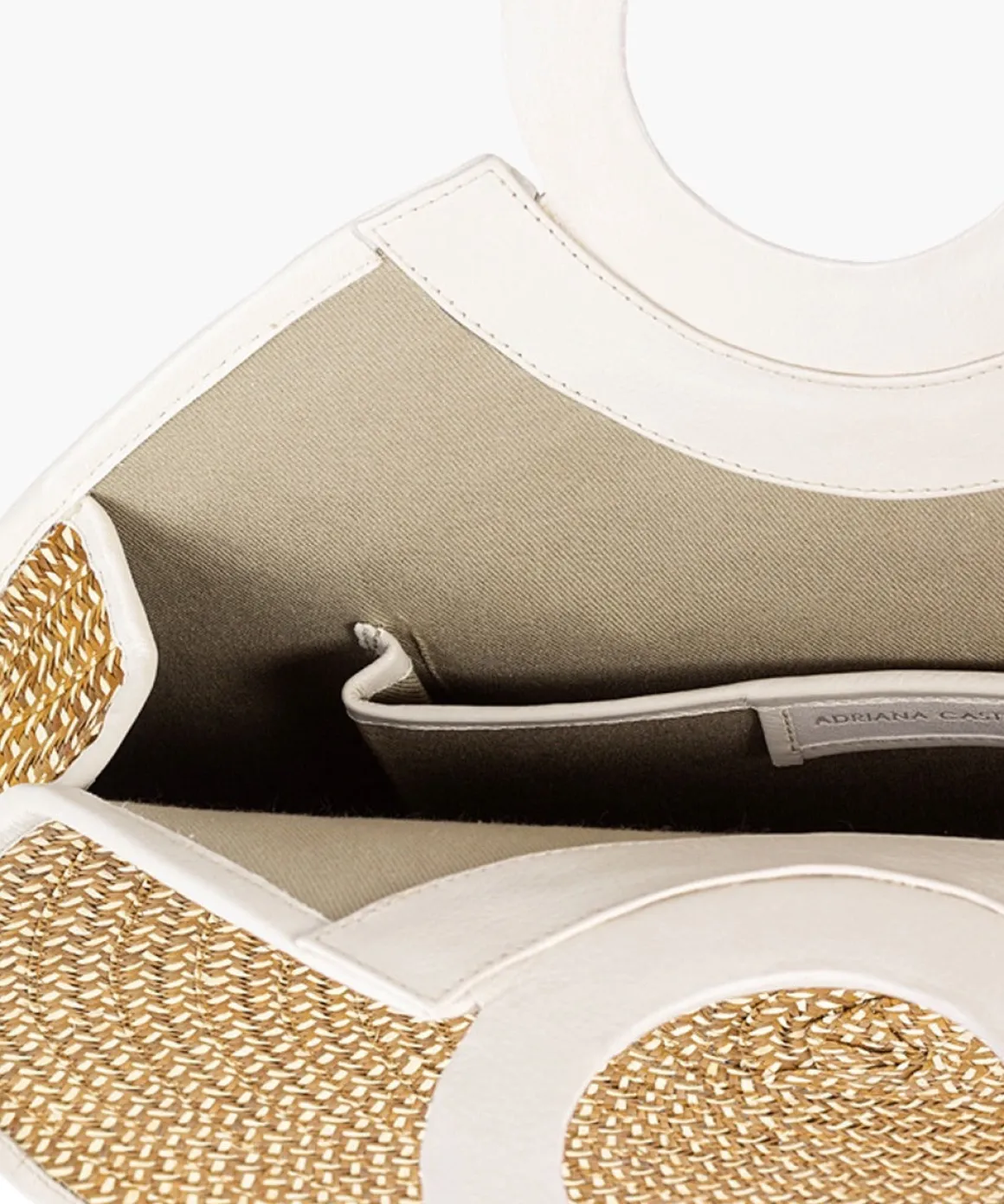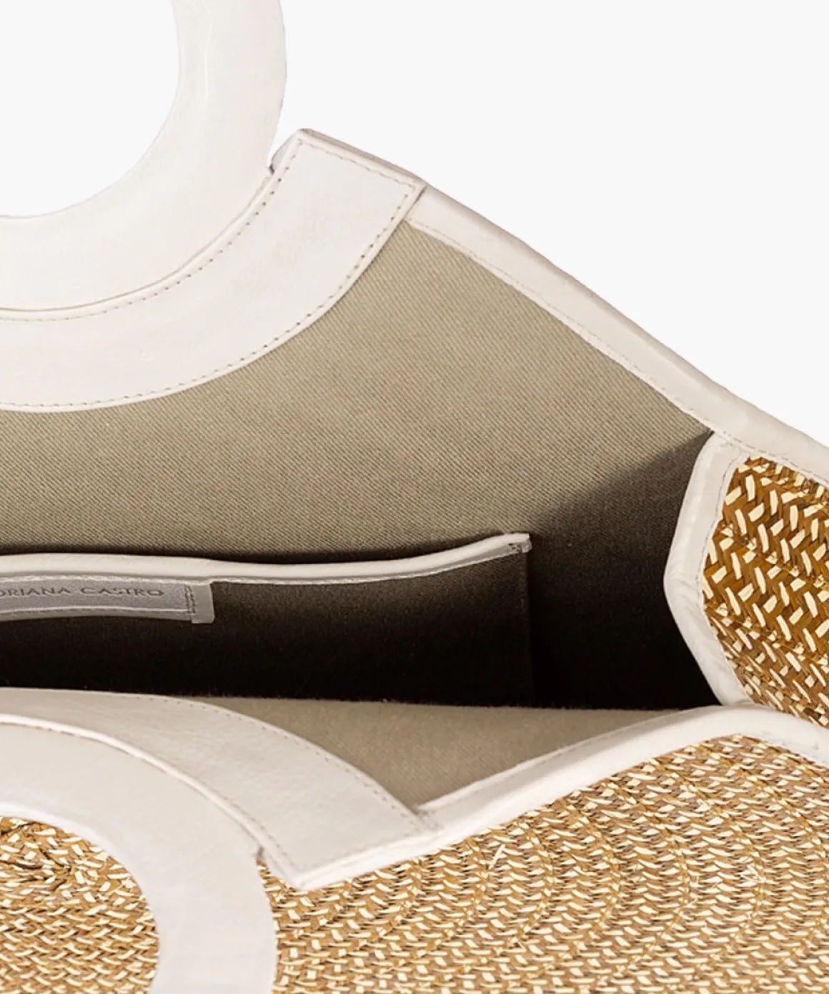 Our Adriana Castro Zenu Large Handbag in Leather and Cana Flecha in Crème is oversized in a round silhouette with a flat bottom and round top handles. This distinctive satchel is detailed with a canvas fabric lining and an interior pocket to hold small items. Handcrafted by artisans in Colombia.